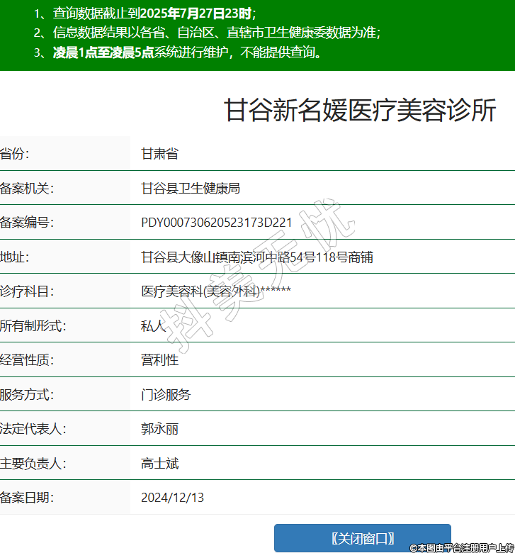省份:甘肅省備案機(jī)關(guān):甘谷縣衛(wèi)生健康局備案編號:PDY000730620523173D221地址:甘谷縣大像山鎮(zhèn)南濱河中路54號118號商鋪診療科目:醫(yī)療美容科(美容外科)******所有制形式:私人經(jīng)營性質(zhì):營利性服務(wù)方式:門診服務(wù)法定代表人:郭永麗主要負(fù)責(zé)人:高士斌備案日期:2024/12/13 -