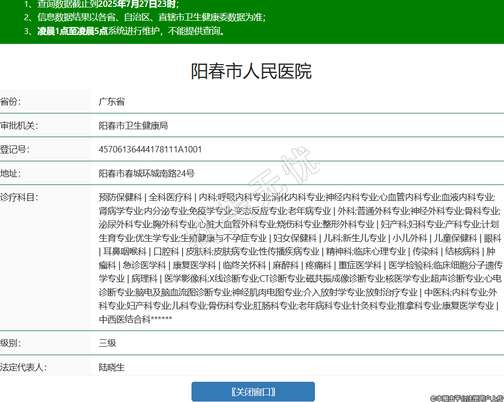 省份:廣東省審批機(jī)關(guān):陽春市衛(wèi)生健康局登記號:45706136444178111A1001地址:陽春市春城環(huán)城南路24號診療科目:預(yù)防保健科 | 全科醫(yī)療科 | 內(nèi)科;呼吸內(nèi)科專業(yè);消化內(nèi)科專業(yè);神經(jīng)內(nèi)科專業(yè);心血管內(nèi)科專業(yè);血液內(nèi)科專業(yè);腎病學(xué)專業(yè);內(nèi)分泌專業(yè);免疫學(xué)專業(yè);變態(tài)反應(yīng)專業(yè);老年病專業(yè) | 外科;普通外科專業(yè);神經(jīng)外科專業(yè);骨科專業(yè);泌尿外科專業(yè);胸外科專業(yè);心臟大血管外科專業(yè);燒傷科專業(yè);整形外科專業(yè) | 婦產(chǎn)科;婦科專業(yè);產(chǎn)科專業(yè);計(jì)劃生育專業(yè);優(yōu)生學(xué)專業(yè);生殖健康與不孕癥專業(yè) | 婦女保健科 | 兒科;新生兒專業(yè) | 小兒外科 | 兒童保健科 | 眼科 | 耳鼻咽喉科 | 口腔科 | 皮膚科;皮膚病專業(yè);性傳播疾病專業(yè) | 精神科;臨床心理專業(yè) | 傳染科 | 結(jié)核病科 | 腫瘤科 | 急診醫(yī)學(xué)科 | 康復(fù)醫(yī)學(xué)科 | 臨終關(guān)懷科 | 麻醉科 | 疼痛科 | 重癥醫(yī)學(xué)科 | 醫(yī)學(xué)檢驗(yàn)科;臨床細(xì)胞分子遺傳學(xué)專業(yè) | 病理科 | 醫(yī)學(xué)影像科;X線診斷專業(yè);CT診斷專業(yè);磁共振成像診斷專業(yè);核醫(yī)學(xué)專業(yè);超聲診斷專業(yè);心電診斷專業(yè);腦電及腦血流圖診斷專業(yè);神經(jīng)肌肉電圖專業(yè);介入放射學(xué)專業(yè);放射治療專業(yè) | 中醫(yī)科;內(nèi)科專業(yè);外科專業(yè);婦產(chǎn)科專業(yè);兒科專業(yè);骨傷科專業(yè);肛腸科專業(yè);老年病科專業(yè);針灸科專業(yè);推拿科專業(yè);康復(fù)醫(yī)學(xué)專業(yè) | 中西醫(yī)結(jié)合科******級別:三級法定代表人:陸曉生主要負(fù)責(zé)人:陸曉生執(zhí)業(yè)許可證有效期:2022/12/20 -至- 2037/12/20 -