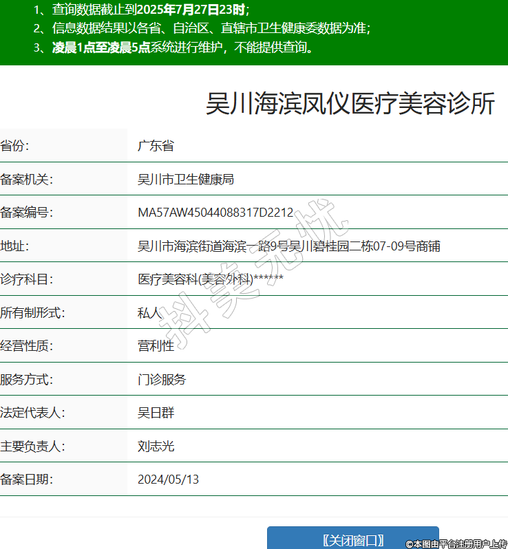 省份:廣東省備案機(jī)關(guān):吳川市衛(wèi)生健康局備案編號(hào):MA57AW45044088317D2212地址:吳川市海濱街道海濱一路9號(hào)吳川碧桂園二棟07-09號(hào)商鋪診療科目:醫(yī)療美容科(美容外科)******所有制形式:私人經(jīng)營性質(zhì):營利性服務(wù)方式:門診服務(wù)法定代表人:吳日群主要負(fù)責(zé)人:劉志光備案日期:2024/05/13 -