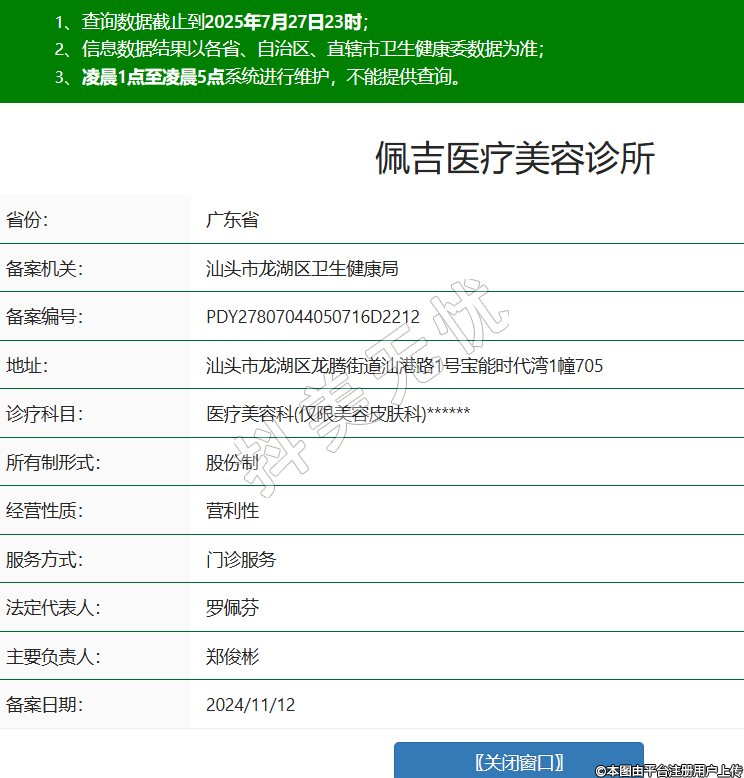 省份:廣東省備案機(jī)關(guān):汕頭市龍湖區(qū)衛(wèi)生健康局備案編號(hào):PDY27807044050716D2212地址:汕頭市龍湖區(qū)龍騰街道汕港路1號(hào)寶能時(shí)代灣1幢705診療科目:醫(yī)療美容科(僅限美容皮膚科)******所有制形式:股份制經(jīng)營(yíng)性質(zhì):營(yíng)利性服務(wù)方式:門診服務(wù)法定代表人:羅佩芬主要負(fù)責(zé)人:鄭俊彬備案日期:2024/11/12 -