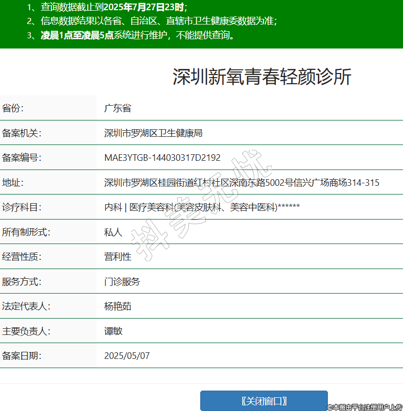 省份:廣東省備案機(jī)關(guān):深圳市羅湖區(qū)衛(wèi)生健康局備案編號(hào):MAE3YTGB-144030317D2192地址:深圳市羅湖區(qū)桂園街道紅村社區(qū)深南東路5002號(hào)信興廣場(chǎng)商場(chǎng)314-315診療科目:內(nèi)科 | 醫(yī)療美容科(美容皮膚科、美容中醫(yī)科)******所有制形式:私人經(jīng)營(yíng)性質(zhì):營(yíng)利性服務(wù)方式:門診服務(wù)法定代表人:楊艷茹主要負(fù)責(zé)人:譚敏備案日期:2025/05/07 -