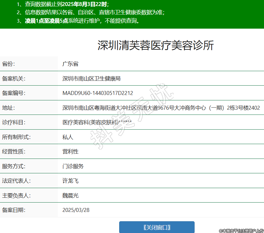省份:廣東省備案機關:深圳市南山區(qū)衛(wèi)生健康局備案編號:MADD9U60-144030517D2212地址:深圳市南山區(qū)粵海街道大沖社區(qū)深南大道9676號大沖商務中心(一期)2棟3號樓2402診療科目:醫(yī)療美容科(美容皮膚科)******所有制形式:私人經營性質:營利性服務方式:門診服務法定代表人:許龍飛主要負責人:魏晨光備案日期:2025/03/28 -
