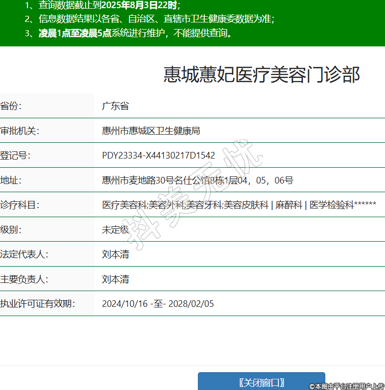 省份:廣東省審批機關(guān):惠州市惠城區(qū)衛(wèi)生健康局登記號:PDY23334-X44130217D1542地址:惠州市麥地路30號名仕公館B棟1層04,05,06號診療科目:醫(yī)療美容科;美容外科;美容牙科;美容皮膚科 | 麻醉科 | 醫(yī)學檢驗科******級別:未定級法定代表人:劉本清主要負責人:劉本清執(zhí)業(yè)許可證有效期:2024/10/16 -至- 2028/02/05 -