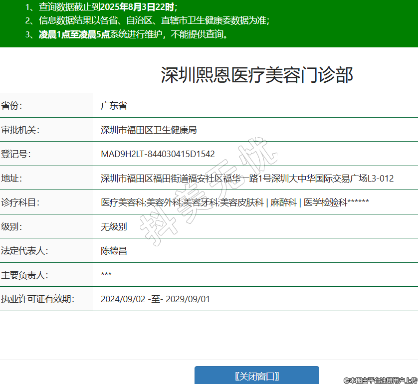省份:廣東省審批機(jī)關(guān):深圳市福田區(qū)衛(wèi)生健康局登記號(hào):MAD9H2LT-844030415D1542地址:深圳市福田區(qū)福田街道福安社區(qū)福華一路1號(hào)深圳大中華國際交易廣場L3-012診療科目:醫(yī)療美容科;美容外科;美容牙科;美容皮膚科 | 麻醉科 | 醫(yī)學(xué)檢驗(yàn)科******級(jí)別:無級(jí)別法定代表人:陳德昌主要負(fù)責(zé)人:***執(zhí)業(yè)許可證有效期:2024/09/02 -至- 2029/09/01 -