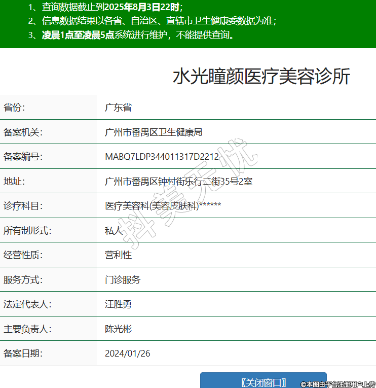 省份:廣東省備案機(jī)關(guān):廣州市番禺區(qū)衛(wèi)生健康局備案編號(hào):MABQ7LDP344011317D2212地址:廣州市番禺區(qū)鐘村街樂行二街35號(hào)2室診療科目:醫(yī)療美容科(美容皮膚科)******所有制形式:私人經(jīng)營性質(zhì):營利性服務(wù)方式:門診服務(wù)法定代表人:汪勝勇主要負(fù)責(zé)人:陳光彬備案日期:2024/01/26 -