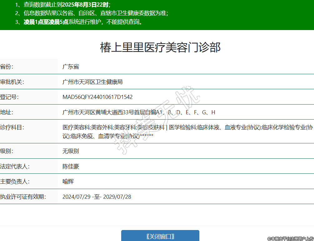 省份:廣東省審批機(jī)關(guān):廣州市天河區(qū)衛(wèi)生健康局登記號:MAD56QFY244010617D1542地址:廣州市天河區(qū)黃埔大道西33號首層自編A1、B、D、E、F、G、H診療科目:醫(yī)療美容科;美容外科;美容牙科;美容皮膚科 | 醫(yī)學(xué)檢驗科;臨床體液、血液專業(yè)(協(xié)議);臨床化學(xué)檢驗專業(yè)(協(xié)議);臨床免疫、血清學(xué)專業(yè)(協(xié)議)******級別:無級別法定代表人:陳佳豪主要負(fù)責(zé)人:喻輝執(zhí)業(yè)許可證有效期:2024/07/29 -至- 2029/07/28 -
