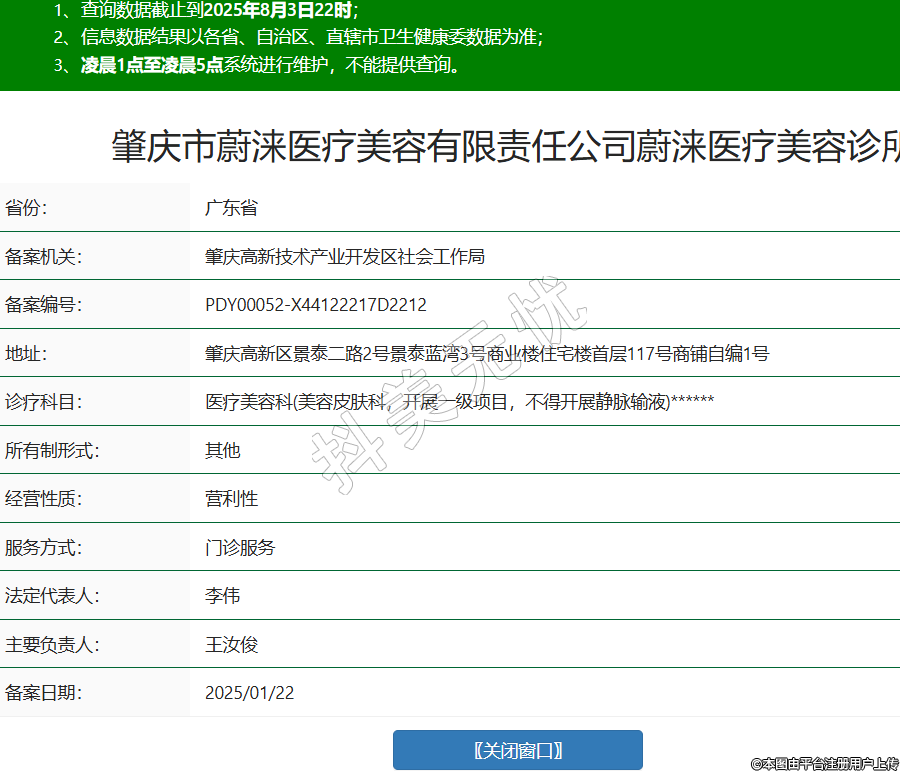 省份:廣東省備案機(jī)關(guān):肇慶高新技術(shù)產(chǎn)業(yè)開發(fā)區(qū)社會(huì)工作局備案編號(hào):PDY00052-X44122217D2212地址:肇慶高新區(qū)景泰二路2號(hào)景泰藍(lán)灣3號(hào)商業(yè)樓住宅樓首層117號(hào)商鋪?zhàn)跃?號(hào)診療科目:醫(yī)療美容科(美容皮膚科,開展一級(jí)項(xiàng)目,不得開展靜脈輸液)******所有制形式:其他經(jīng)營性質(zhì):營利性服務(wù)方式:門診服務(wù)法定代表人:李偉主要負(fù)責(zé)人:王汝俊備案日期:2025/01/22 -