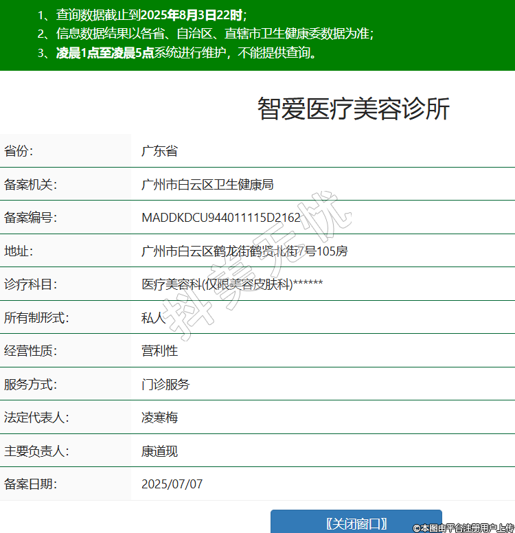 省份:廣東省備案機關(guān):廣州市白云區(qū)衛(wèi)生健康局備案編號:MADDKDCU944011115D2162地址:廣州市白云區(qū)鶴龍街鶴賢北街7號105房診療科目:醫(yī)療美容科(僅限美容皮膚科)******所有制形式:私人經(jīng)營性質(zhì):營利性服務方式:門診服務法定代表人:凌寒梅主要負責人:康道現(xiàn)備案日期:2025/07/07 -