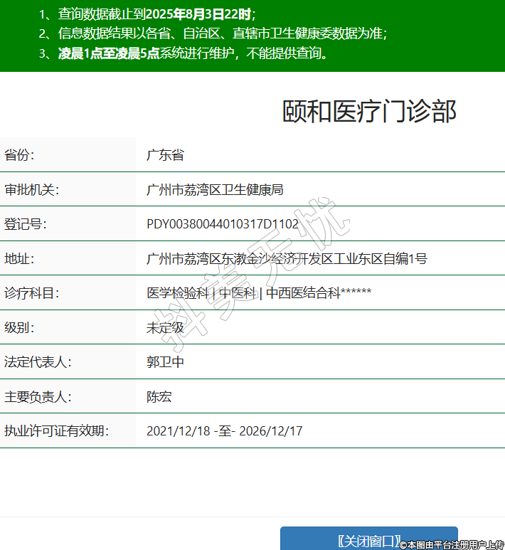 省份:廣東省審批機(jī)關(guān):廣州市荔灣區(qū)衛(wèi)生健康局登記號:PDY00380044010317D1102地址:廣州市荔灣區(qū)東漖金沙經(jīng)濟(jì)開發(fā)區(qū)工業(yè)東區(qū)自編1號診療科目:醫(yī)學(xué)檢驗科 | 中醫(yī)科 | 中西醫(yī)結(jié)合科******級別:未定級法定代表人:郭衛(wèi)中主要負(fù)責(zé)人:陳宏執(zhí)業(yè)許可證有效期:2021/12/18 -至- 2026/12/17 -