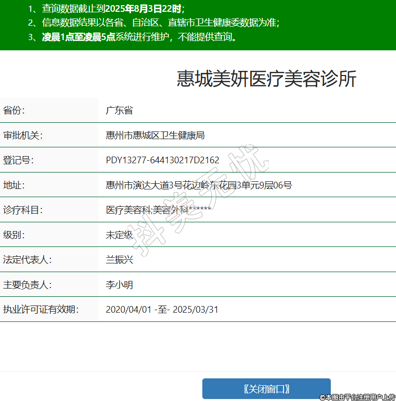 省份:廣東省審批機(jī)關(guān):惠州市惠城區(qū)衛(wèi)生健康局登記號:PDY13277-644130217D2162地址:惠州市演達(dá)大道3號花邊嶺東花園3單元9層06號診療科目:醫(yī)療美容科;美容外科******級別:未定級法定代表人:蘭振興主要負(fù)責(zé)人:李小明執(zhí)業(yè)許可證有效期:2020/04/01 -至- 2025/03/31 -