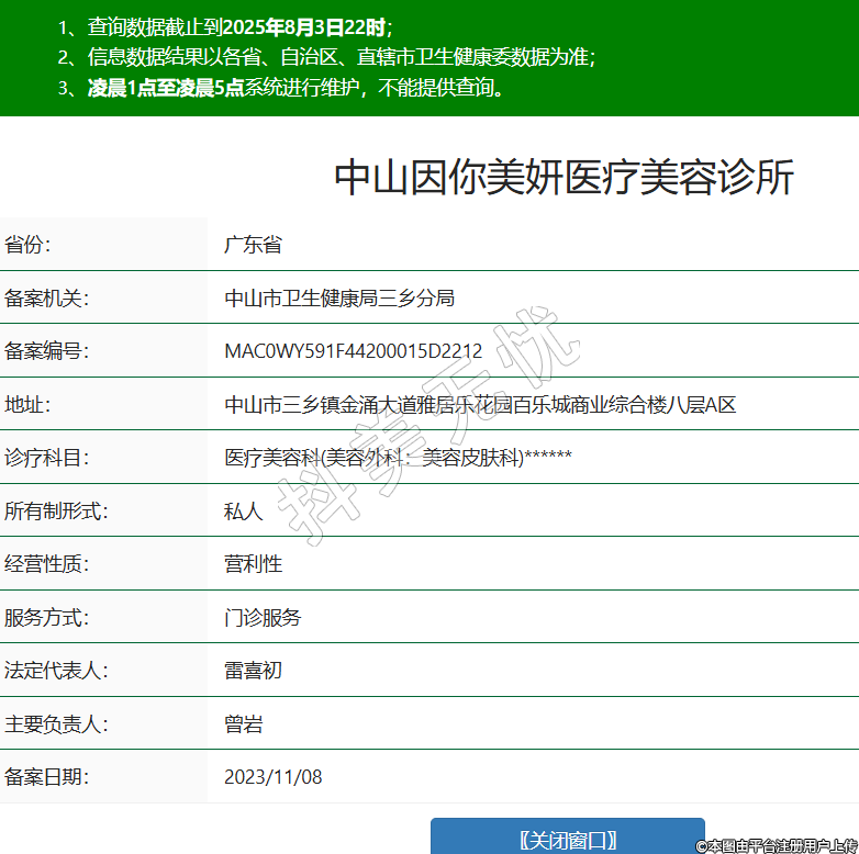中山因你美妍醫(yī)療美容診所,診療科目:醫(yī)療美容科(美容外科:美容皮膚科)******