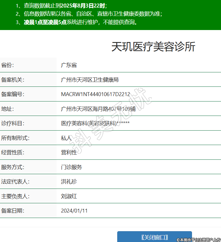 省份:廣東省備案機關(guān):廣州市天河區(qū)衛(wèi)生健康局備案編號:MACRW1NT444010617D2212地址:廣州市天河區(qū)海月路407號109鋪診療科目:醫(yī)療美容科(美容皮膚科)******所有制形式:私人經(jīng)營性質(zhì):營利性服務方式:門診服務法定代表人:洪禮珍主要負責人:劉淑紅備案日期:2024/01/11 -