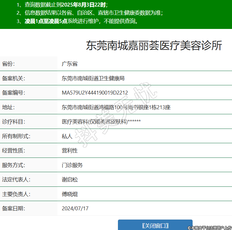 省份:廣東省備案機(jī)關(guān):東莞市南城街道衛(wèi)生健康局備案編號(hào):MA579U2Y444190019D2212地址:東莞市南城街道鴻福路100號(hào)尚書(shū)銀座1棟213座診療科目:醫(yī)療美容科(僅限美容皮膚科)******所有制形式:私人經(jīng)營(yíng)性質(zhì):營(yíng)利性服務(wù)方式:門診服務(wù)法定代表人:謝啟松主要負(fù)責(zé)人:傅曉焜備案日期:2024/07/17 -