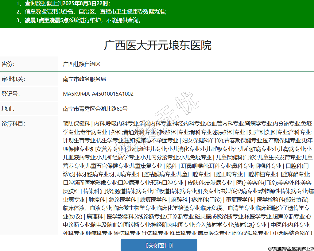 省份:廣西壯族自治區(qū)審批機(jī)關(guān):南寧市政務(wù)服務(wù)局登記號:MA5K9R4A-A45010015A1002地址:南寧市青秀區(qū)金湖北路60號診療科目:預(yù)防保健科 | 內(nèi)科;呼吸內(nèi)科專業(yè);消化內(nèi)科專業(yè);神經(jīng)內(nèi)科專業(yè);心血管內(nèi)科專業(yè);腎病學(xué)專業(yè);內(nèi)分泌專業(yè);免疫學(xué)專業(yè);老年病專業(yè) | 外科;普通外科專業(yè);神經(jīng)外科專業(yè);骨科專業(yè);泌尿外科專業(yè) | 婦產(chǎn)科;婦科專業(yè);產(chǎn)科專業(yè);計(jì)劃生育專業(yè);優(yōu)生學(xué)專業(yè);生殖健康與不孕癥專業(yè) | 婦女保健科(門診);青春期保健專業(yè);圍產(chǎn)期保健專業(yè);更年期保健專業(yè);婦女營養(yǎng)專業(yè) | 兒科;新生兒專業(yè);小兒消化專業(yè);小兒呼吸專業(yè);小兒心臟病專業(yè);小兒腎病專業(yè);小兒血液病專業(yè);小兒神經(jīng)病學(xué)專業(yè);小兒內(nèi)分泌專業(yè);小兒免疫專業(yè) | 兒童保健科(門診);兒童生長發(fā)育專業(yè);兒童營養(yǎng)專業(yè);兒童五官保健專業(yè);兒童康復(fù)專業(yè) | 眼科 | 耳鼻咽喉科;耳科專業(yè);鼻科專業(yè);咽喉科專業(yè) | 口腔科(門診);牙體牙髓病專業(yè);牙周病專業(yè);口腔粘膜病專業(yè);兒童口腔專業(yè);口腔正畸專業(yè);口腔種植專業(yè);口腔麻醉專業(yè);口腔頜面醫(yī)學(xué)影像專業(yè);口腔病理專業(yè);預(yù)防口腔專業(yè) | 皮膚科;皮膚病專業(yè) | 醫(yī)療美容科(門診);美容外科;美容皮膚科 | 傳染科(門診);腸道傳染病專業(yè);呼吸道傳染病專業(yè);肝炎專業(yè);蟲媒傳染病專業(yè);動(dòng)物源性傳染病專業(yè);蠕蟲病專業(yè) | 腫瘤科 | 急診醫(yī)學(xué)科 | 康復(fù)醫(yī)學(xué)科 | 麻醉科 | 疼痛科(門診) | 重癥醫(yī)學(xué)科 | 醫(yī)學(xué)檢驗(yàn)科(部分協(xié)議);臨床體液、血液專業(yè);臨床微生物學(xué)專業(yè);臨床化學(xué)檢驗(yàn)專業(yè);臨床免疫、血清學(xué)專業(yè);臨床細(xì)胞分子遺傳學(xué)專業(yè)(協(xié)議) | 病理科 | 醫(yī)學(xué)影像科;X線診斷專業(yè);CT診斷專業(yè);磁共振成像診斷專業(yè);核醫(yī)學(xué)專業(yè);超聲診斷專業(yè);心電診斷專業(yè);腦電及腦血流圖診斷專業(yè);神經(jīng)肌肉電圖專業(yè);介入放射學(xué)專業(yè);放射治療專業(yè) | 中醫(yī)科;內(nèi)科專業(yè);外科專業(yè);腫瘤科專業(yè);骨傷科專業(yè);針灸科專業(yè);推拿科專業(yè);康復(fù)醫(yī)學(xué)專業(yè);預(yù)防保健科專業(yè) | 中西醫(yī)結(jié)合科(門診)******級別:三級法定代表人:吳想軍主要負(fù)責(zé)人:劉震宇執(zhí)業(yè)許可證有效期:2025/05/30 -至- 2034/01/20 -