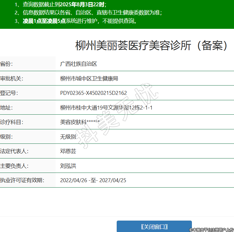 省份:廣西壯族自治區(qū)審批機(jī)關(guān):柳州市城中區(qū)衛(wèi)生健康局登記號(hào):PDY02365-X45020215D2162地址:柳州市桂中大道19號(hào)文源華都12棟2-1-1診療科目:美容皮膚科******級(jí)別:無(wú)級(jí)別法定代表人:鄧恩蕓主要負(fù)責(zé)人:劉泓洪執(zhí)業(yè)許可證有效期:2022/04/26 -至- 2027/04/25 -