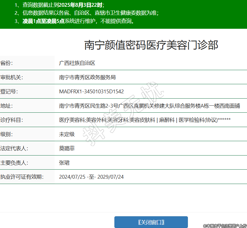 省份:廣西壯族自治區(qū)審批機(jī)關(guān):南寧市青秀區(qū)政務(wù)服務(wù)局登記號:MADFRX1-345010315D1542地址:南寧市青秀區(qū)民生路2-3號廣西區(qū)直屬機(jī)關(guān)修建大隊綜合服務(wù)樓A棟一樓西南面鋪診療科目:醫(yī)療美容科;美容外科;美容牙科;美容皮膚科 | 麻醉科 | 醫(yī)學(xué)檢驗科(協(xié)議)******級別:未定級法定代表人:莫璐菲主要負(fù)責(zé)人:張珺執(zhí)業(yè)許可證有效期:2024/07/25 -至- 2029/07/24 -