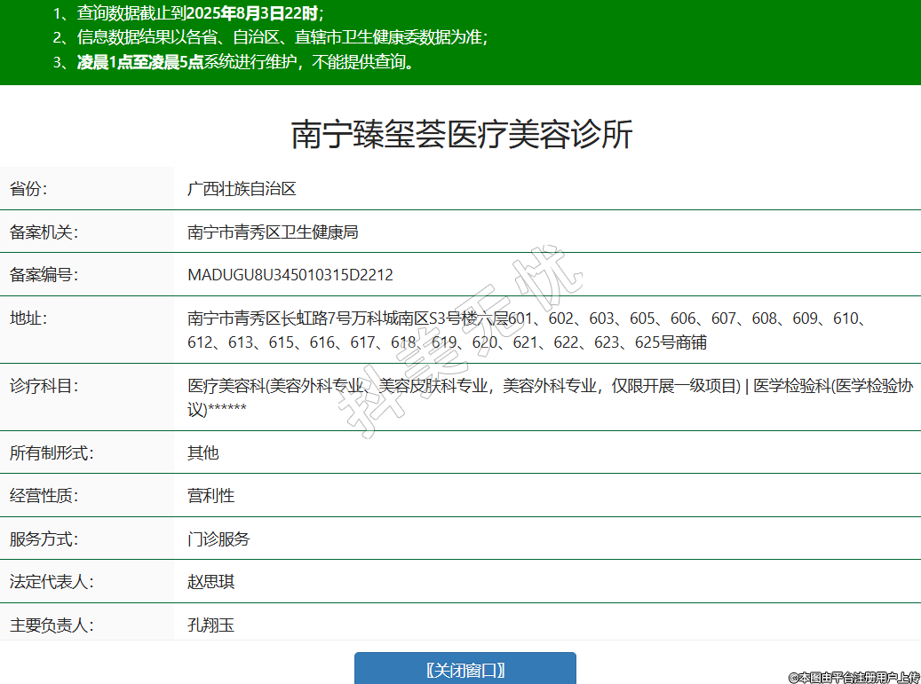 省份:廣西壯族自治區(qū)備案機(jī)關(guān):南寧市青秀區(qū)衛(wèi)生健康局備案編號(hào):MADUGU8U345010315D2212地址:南寧市青秀區(qū)長(zhǎng)虹路7號(hào)萬(wàn)科城南區(qū)S3號(hào)樓六層601、602、603、605、606、607、608、609、610、612、613、615、616、617、618、619、620、621、622、623、625號(hào)商鋪診療科目:醫(yī)療美容科(美容外科專業(yè)、美容皮膚科專業(yè),美容外科專業(yè),僅限開(kāi)展一級(jí)項(xiàng)目) | 醫(yī)學(xué)檢驗(yàn)科(醫(yī)學(xué)檢驗(yàn)協(xié)議)******所有制形式:其他經(jīng)營(yíng)性質(zhì):營(yíng)利性服務(wù)方式:門診服務(wù)法定代表人:趙思琪主要負(fù)責(zé)人:孔翔玉備案日期:2025/07/08 -