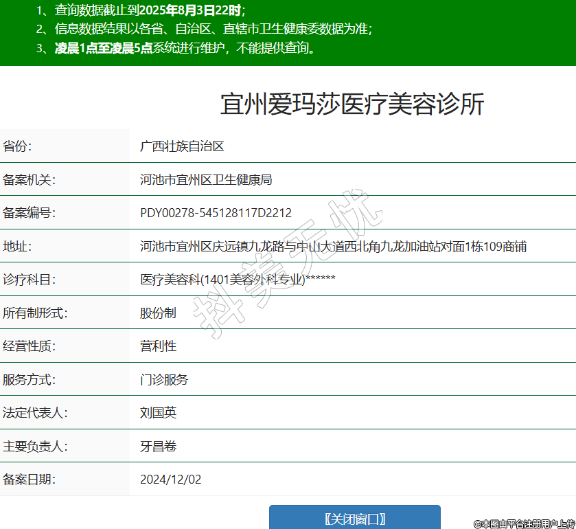 省份:廣西壯族自治區(qū)備案機(jī)關(guān):河池市宜州區(qū)衛(wèi)生健康局備案編號(hào):PDY00278-545128117D2212地址:河池市宜州區(qū)慶遠(yuǎn)鎮(zhèn)九龍路與中山大道西北角九龍加油站對(duì)面1棟109商鋪診療科目:醫(yī)療美容科(1401美容外科專業(yè))******所有制形式:股份制經(jīng)營性質(zhì):營利性服務(wù)方式:門診服務(wù)法定代表人:劉國英主要負(fù)責(zé)人:牙昌卷備案日期:2024/12/02 -