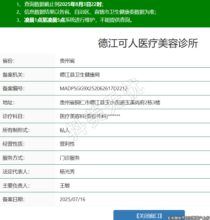 省份:貴州省備案機關(guān):德江縣衛(wèi)生健康局備案編號:MADP5GG9X252062617D2212地址:貴州省銅仁市德江縣玉水街道玉溪尚府2棟3樓診療科目:醫(yī)療美容科(美容外科)******所有制形式:私人經(jīng)營性質(zhì):營利性服務(wù)方式:門診服務(wù)法定代表人:楊光秀主要負(fù)責(zé)人:王敏備案日期:2025/07/16 -