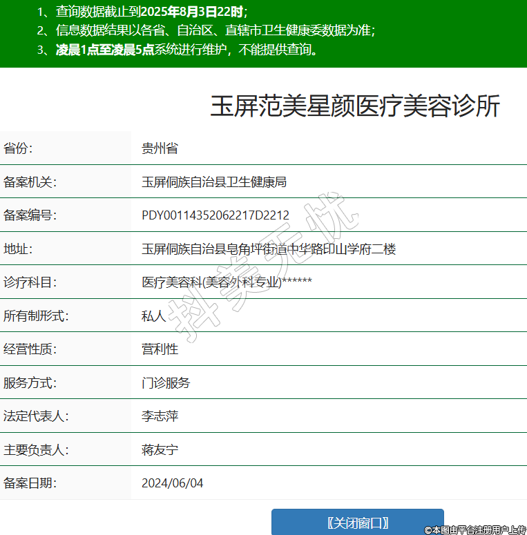 省份:貴州省備案機(jī)關(guān):玉屏侗族自治縣衛(wèi)生健康局備案編號(hào):PDY00114352062217D2212地址:玉屏侗族自治縣皂角坪街道中華路印山學(xué)府二樓診療科目:醫(yī)療美容科(美容外科專業(yè))******所有制形式:私人經(jīng)營(yíng)性質(zhì):營(yíng)利性服務(wù)方式:門診服務(wù)法定代表人:李志萍主要負(fù)責(zé)人:蔣友寧備案日期:2024/06/04 -