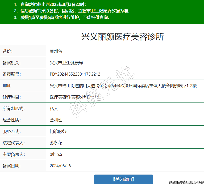 省份:貴州省備案機(jī)關(guān):興義市衛(wèi)生健康局備案編號(hào):PDY20244552230117D2212地址:興義市桔山街道桔山大道瑞金南路54號(hào)原溫州國(guó)際酒店主體大樓旁側(cè)樓醫(yī)療1-2樓診療科目:醫(yī)療美容科(美容外科)******所有制形式:私人經(jīng)營(yíng)性質(zhì):營(yíng)利性服務(wù)方式:門(mén)診服務(wù)法定代表人:蘇永花主要負(fù)責(zé)人:劉寶杰備案日期:2024/06/26 -