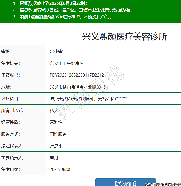 省份:貴州省備案機關(guān):興義市衛(wèi)生健康局備案編號:PDY202312852230117D2212地址:興義市桔山街道金水北路33號診療科目:醫(yī)療美容科(美容皮膚科、美容外科)******所有制形式:私人經(jīng)營性質(zhì):營利性服務方式:門診服務法定代表人:張洪平主要負責人:夏舟備案日期:2023/08/08 -