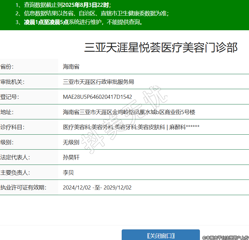 省份:海南省審批機(jī)關(guān):三亞市天涯區(qū)行政審批服務(wù)局登記號:MAE28U5P646020417D1542地址:海南省三亞市天涯區(qū)金雞嶺路鳳凰水城b區(qū)商業(yè)街5號樓診療科目:醫(yī)療美容科;美容外科;美容牙科;美容皮膚科 | 麻醉科******級別:無級別法定代表人:孫昊軒主要負(fù)責(zé)人:李貝執(zhí)業(yè)許可證有效期:2024/12/02 -至- 2029/12/02 -