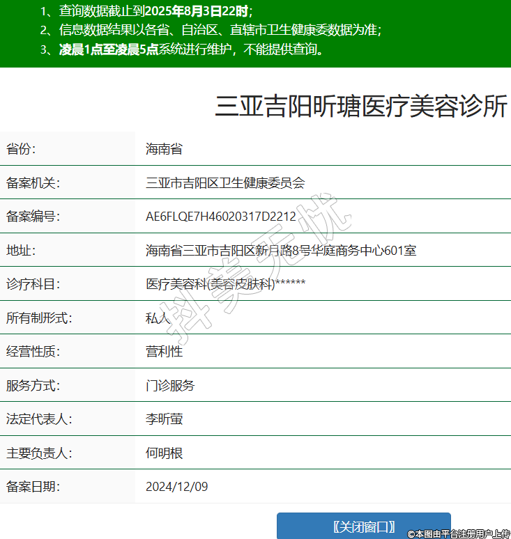 省份:海南省備案機(jī)關(guān):三亞市吉陽區(qū)衛(wèi)生健康委員會備案編號:AE6FLQE7H46020317D2212地址:海南省三亞市吉陽區(qū)新月路8號華庭商務(wù)中心601室診療科目:醫(yī)療美容科(美容皮膚科)******所有制形式:私人經(jīng)營性質(zhì):營利性服務(wù)方式:門診服務(wù)法定代表人:李昕螢主要負(fù)責(zé)人:何明根備案日期:2024/12/09 -