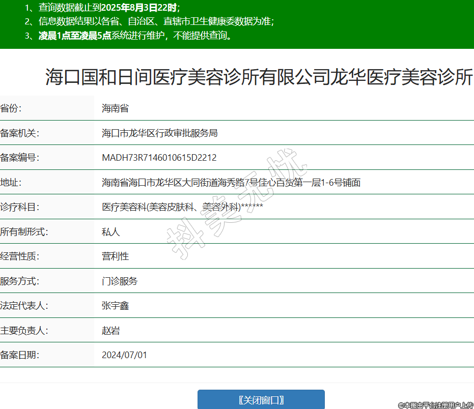 省份:海南省備案機(jī)關(guān):海口市龍華區(qū)行政審批服務(wù)局備案編號(hào):MADH73R7146010615D2212地址:海南省??谑旋埲A區(qū)大同街道海秀路7號(hào)佳心百貨第一層1-6號(hào)鋪面診療科目:醫(yī)療美容科(美容皮膚科、美容外科)******所有制形式:私人經(jīng)營性質(zhì):營利性服務(wù)方式:門診服務(wù)法定代表人:張宇鑫主要負(fù)責(zé)人:趙巖備案日期:2024/07/01 -