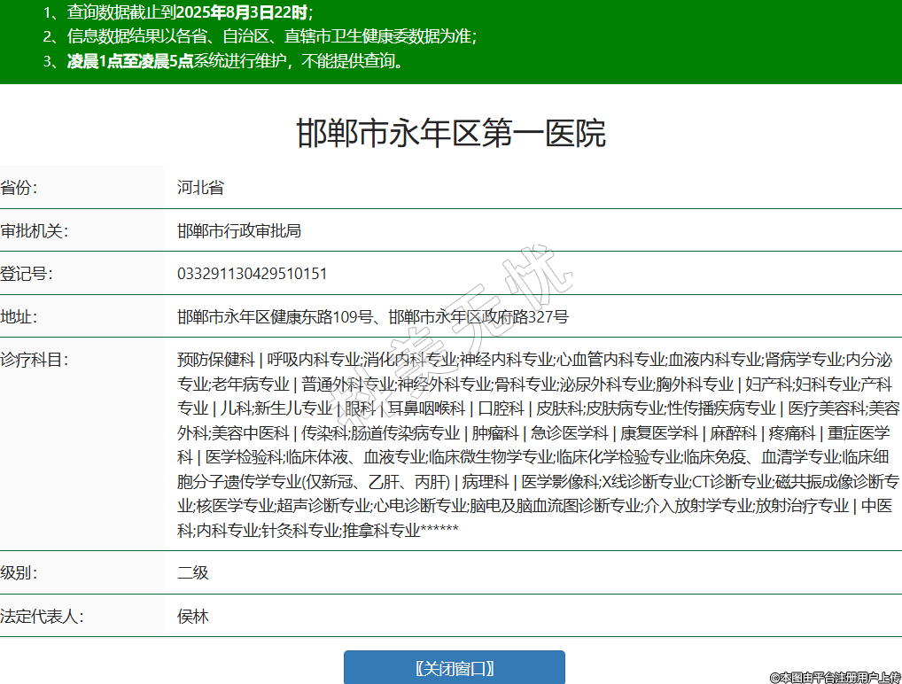 省份:河北省審批機關:邯鄲市行政審批局登記號:033291130429510151地址:邯鄲市永年區(qū)健康東路109號、邯鄲市永年區(qū)政府路327號診療科目:預防保健科 | 呼吸內(nèi)科專業(yè);消化內(nèi)科專業(yè);神經(jīng)內(nèi)科專業(yè);心血管內(nèi)科專業(yè);血液內(nèi)科專業(yè);腎病學專業(yè);內(nèi)分泌專業(yè);老年病專業(yè) | 普通外科專業(yè);神經(jīng)外科專業(yè);骨科專業(yè);泌尿外科專業(yè);胸外科專業(yè) | 婦產(chǎn)科;婦科專業(yè);產(chǎn)科專業(yè) | 兒科;新生兒專業(yè) | 眼科 | 耳鼻咽喉科 | 口腔科 | 皮膚科;皮膚病專業(yè);性傳播疾病專業(yè) | 醫(yī)療美容科;美容外科;美容中醫(yī)科 | 傳染科;腸道傳染病專業(yè) | 腫瘤科 | 急診醫(yī)學科 | 康復醫(yī)學科 | 麻醉科 | 疼痛科 | 重癥醫(yī)學科 | 醫(yī)學檢驗科;臨床體液、血液專業(yè);臨床微生物學專業(yè);臨床化學檢驗專業(yè);臨床免疫、血清學專業(yè);臨床細胞分子遺傳學專業(yè)(僅新冠、乙肝、丙肝) | 病理科 | 醫(yī)學影像科;X線診斷專業(yè);CT診斷專業(yè);磁共振成像診斷專業(yè);核醫(yī)學專業(yè);超聲診斷專業(yè);心電診斷專業(yè);腦電及腦血流圖診斷專業(yè);介入放射學專業(yè);放射治療專業(yè) | 中醫(yī)科;內(nèi)科專業(yè);針灸科專業(yè);推拿科專業(yè)******級別:二級法定代表人:侯林主要負責人:侯林執(zhí)業(yè)許可證有效期:2015/05/15 -至- 2030/05/15 -