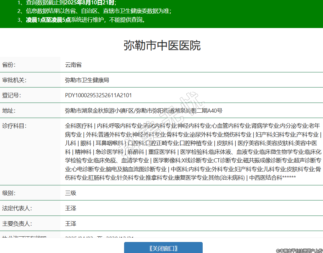 省份:云南省審批機(jī)關(guān):彌勒市衛(wèi)生健康局登記號(hào):PDY10002953252611A2101地址:彌勒市湖泉金秋旅游小鎮(zhèn)F區(qū)/彌勒市彌陽街道湖泉尚景二期A40號(hào)診療科目:全科醫(yī)療科 | 內(nèi)科;呼吸內(nèi)科專業(yè);消化內(nèi)科專業(yè);神經(jīng)內(nèi)科專業(yè);心血管內(nèi)科專業(yè);腎病學(xué)專業(yè);內(nèi)分泌專業(yè);老年病專業(yè) | 外科;普通外科專業(yè);神經(jīng)外科專業(yè);骨科專業(yè);泌尿外科專業(yè);燒傷科專業(yè) | 婦產(chǎn)科;婦科專業(yè);產(chǎn)科專業(yè) | 兒科 | 眼科 | 耳鼻咽喉科 | 口腔科;口腔正畸專業(yè);口腔種植專業(yè) | 皮膚科 | 醫(yī)療美容科;美容皮膚科;美容中醫(yī)科 | 精神科 | 急診醫(yī)學(xué)科 | 麻醉科 | 重癥醫(yī)學(xué)科 | 醫(yī)學(xué)檢驗(yàn)科;臨床體液、血液專業(yè);臨床微生物學(xué)專業(yè);臨床化學(xué)檢驗(yàn)專業(yè);臨床免疫、血清學(xué)專業(yè) | 醫(yī)學(xué)影像科;X線診斷專業(yè);CT診斷專業(yè);磁共振成像診斷專業(yè);超聲診斷專業(yè);心電診斷專業(yè);腦電及腦血流圖診斷專業(yè) | 中醫(yī)科;內(nèi)科專業(yè);外科專業(yè);婦產(chǎn)科專業(yè);兒科專業(yè);皮膚科專業(yè);骨傷科專業(yè);肛腸科專業(yè);針灸科專業(yè);推拿科專業(yè);康復(fù)醫(yī)學(xué)專業(yè);其他(治未病科) | 中西醫(yī)結(jié)合科******級別:三級法定代表人:王澤主要負(fù)責(zé)人:王澤執(zhí)業(yè)許可證有效期:2025/04/03 -至- 2038/12/21 -