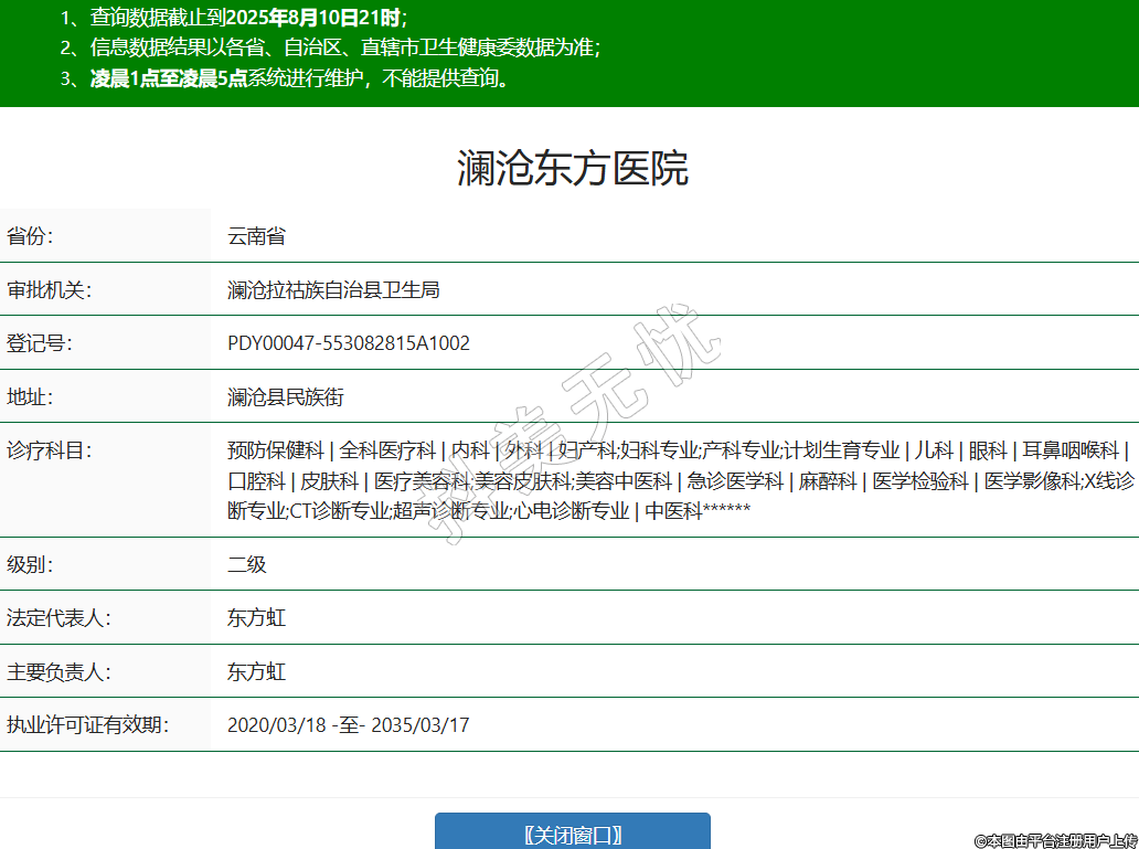 省份:云南省審批機(jī)關(guān):瀾滄拉祜族自治縣衛(wèi)生局登記號(hào):PDY00047-553082815A1002地址:瀾滄縣民族街診療科目:預(yù)防保健科 | 全科醫(yī)療科 | 內(nèi)科 | 外科 | 婦產(chǎn)科;婦科專業(yè);產(chǎn)科專業(yè);計(jì)劃生育專業(yè) | 兒科 | 眼科 | 耳鼻咽喉科 | 口腔科 | 皮膚科 | 醫(yī)療美容科;美容皮膚科;美容中醫(yī)科 | 急診醫(yī)學(xué)科 | 麻醉科 | 醫(yī)學(xué)檢驗(yàn)科 | 醫(yī)學(xué)影像科;X線診斷專業(yè);CT診斷專業(yè);超聲診斷專業(yè);心電診斷專業(yè) | 中醫(yī)科******級(jí)別:二級(jí)法定代表人:東方虹主要負(fù)責(zé)人:東方虹執(zhí)業(yè)許可證有效期:2020/03/18 -至- 2035/03/17 -