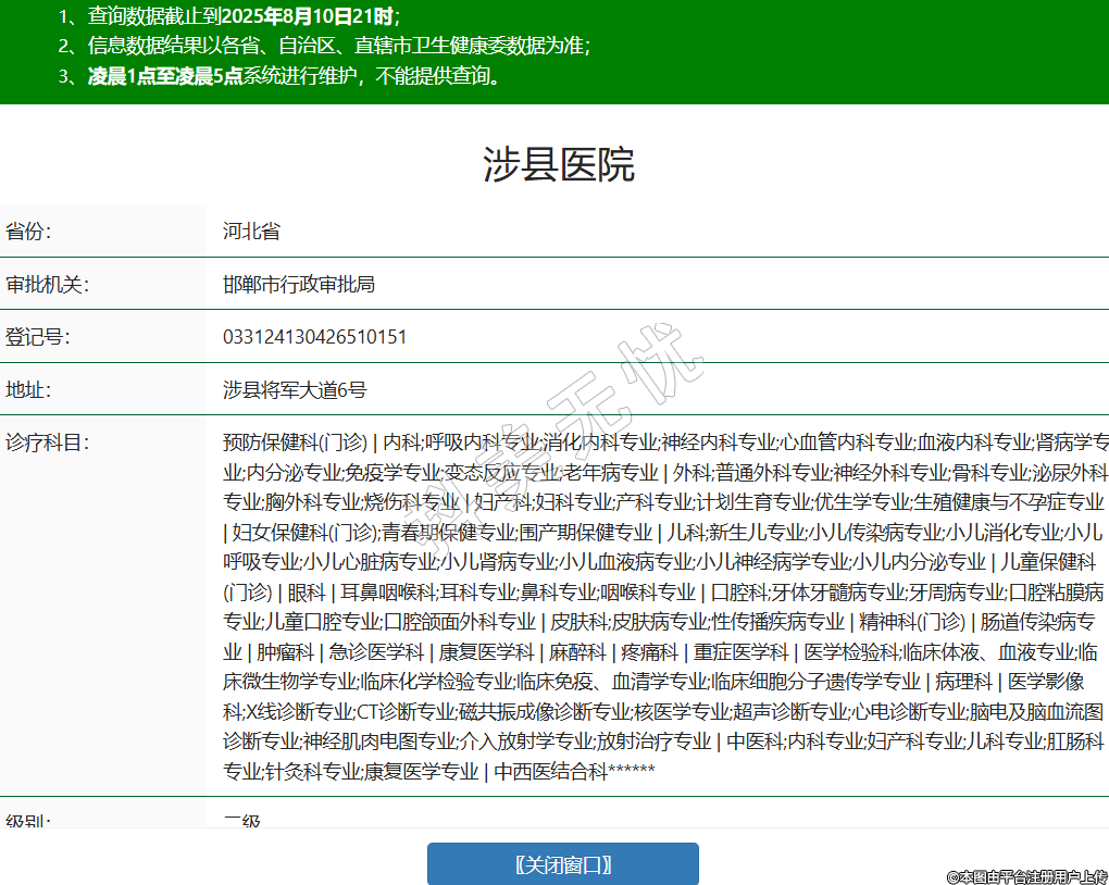 省份:河北省審批機關:邯鄲市行政審批局登記號:033124130426510151地址:涉縣將軍大道6號診療科目:預防保健科(門診) | 內科;呼吸內科專業(yè);消化內科專業(yè);神經(jīng)內科專業(yè);心血管內科專業(yè);血液內科專業(yè);腎病學專業(yè);內分泌專業(yè);免疫學專業(yè);變態(tài)反應專業(yè);老年病專業(yè) | 外科;普通外科專業(yè);神經(jīng)外科專業(yè);骨科專業(yè);泌尿外科專業(yè);胸外科專業(yè);燒傷科專業(yè) | 婦產科;婦科專業(yè);產科專業(yè);計劃生育專業(yè);優(yōu)生學專業(yè);生殖健康與不孕癥專業(yè) | 婦女保健科(門診);青春期保健專業(yè);圍產期保健專業(yè) | 兒科;新生兒專業(yè);小兒傳染病專業(yè);小兒消化專業(yè);小兒呼吸專業(yè);小兒心臟病專業(yè);小兒腎病專業(yè);小兒血液病專業(yè);小兒神經(jīng)病學專業(yè);小兒內分泌專業(yè) | 兒童保健科(門診) | 眼科 | 耳鼻咽喉科;耳科專業(yè);鼻科專業(yè);咽喉科專業(yè) | 口腔科;牙體牙髓病專業(yè);牙周病專業(yè);口腔粘膜病專業(yè);兒童口腔專業(yè);口腔頜面外科專業(yè) | 皮膚科;皮膚病專業(yè);性傳播疾病專業(yè) | 精神科(門診) | 腸道傳染病專業(yè) | 腫瘤科 | 急診醫(yī)學科 | 康復醫(yī)學科 | 麻醉科 | 疼痛科 | 重癥醫(yī)學科 | 醫(yī)學檢驗科;臨床體液、血液專業(yè);臨床微生物學專業(yè);臨床化學檢驗專業(yè);臨床免疫、血清學專業(yè);臨床細胞分子遺傳學專業(yè) | 病理科 | 醫(yī)學影像科;X線診斷專業(yè);CT診斷專業(yè);磁共振成像診斷專業(yè);核醫(yī)學專業(yè);超聲診斷專業(yè);心電診斷專業(yè);腦電及腦血流圖診斷專業(yè);神經(jīng)肌肉電圖專業(yè);介入放射學專業(yè);放射治療專業(yè) | 中醫(yī)科;內科專業(yè);婦產科專業(yè);兒科專業(yè);肛腸科專業(yè);針灸科專業(yè);康復醫(yī)學專業(yè) | 中西醫(yī)結合科******級別:二級法定代表人:付彩文主要負責人:付彩文執(zhí)業(yè)許可證有效期:2025/05/15 -至- 2040/05/14 -