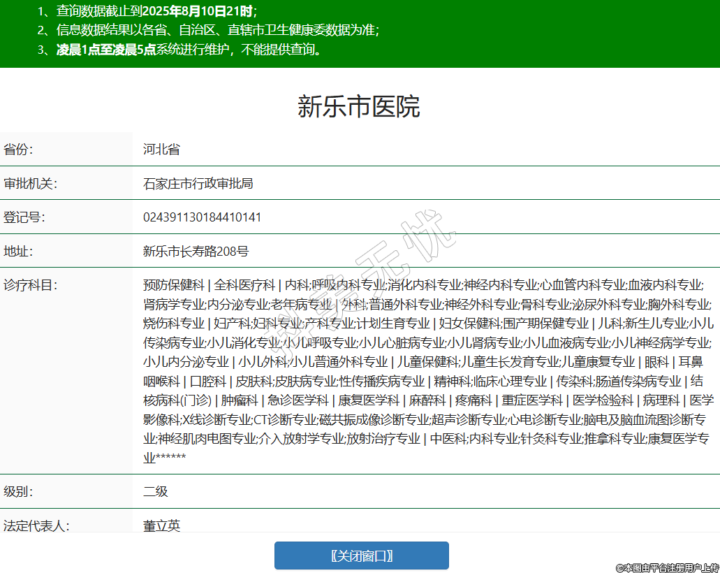 省份:河北省審批機關:石家莊市行政審批局登記號:024391130184410141地址:新樂市長壽路208號診療科目:預防保健科 | 全科醫(yī)療科 | 內(nèi)科;呼吸內(nèi)科專業(yè);消化內(nèi)科專業(yè);神經(jīng)內(nèi)科專業(yè);心血管內(nèi)科專業(yè);血液內(nèi)科專業(yè);腎病學專業(yè);內(nèi)分泌專業(yè);老年病專業(yè) | 外科;普通外科專業(yè);神經(jīng)外科專業(yè);骨科專業(yè);泌尿外科專業(yè);胸外科專業(yè);燒傷科專業(yè) | 婦產(chǎn)科;婦科專業(yè);產(chǎn)科專業(yè);計劃生育專業(yè) | 婦女保健科;圍產(chǎn)期保健專業(yè) | 兒科;新生兒專業(yè);小兒傳染病專業(yè);小兒消化專業(yè);小兒呼吸專業(yè);小兒心臟病專業(yè);小兒腎病專業(yè);小兒血液病專業(yè);小兒神經(jīng)病學專業(yè);小兒內(nèi)分泌專業(yè) | 小兒外科;小兒普通外科專業(yè) | 兒童保健科;兒童生長發(fā)育專業(yè);兒童康復專業(yè) | 眼科 | 耳鼻咽喉科 | 口腔科 | 皮膚科;皮膚病專業(yè);性傳播疾病專業(yè) | 精神科;臨床心理專業(yè) | 傳染科;腸道傳染病專業(yè) | 結(jié)核病科(門診) | 腫瘤科 | 急診醫(yī)學科 | 康復醫(yī)學科 | 麻醉科 | 疼痛科 | 重癥醫(yī)學科 | 醫(yī)學檢驗科 | 病理科 | 醫(yī)學影像科;X線診斷專業(yè);CT診斷專業(yè);磁共振成像診斷專業(yè);超聲診斷專業(yè);心電診斷專業(yè);腦電及腦血流圖診斷專業(yè);神經(jīng)肌肉電圖專業(yè);介入放射學專業(yè);放射治療專業(yè) | 中醫(yī)科;內(nèi)科專業(yè);針灸科專業(yè);推拿科專業(yè);康復醫(yī)學專業(yè)******級別:二級法定代表人:董立英主要負責人:封英杰執(zhí)業(yè)許可證有效期:2024/12/18 -至- 2030/07/31 -