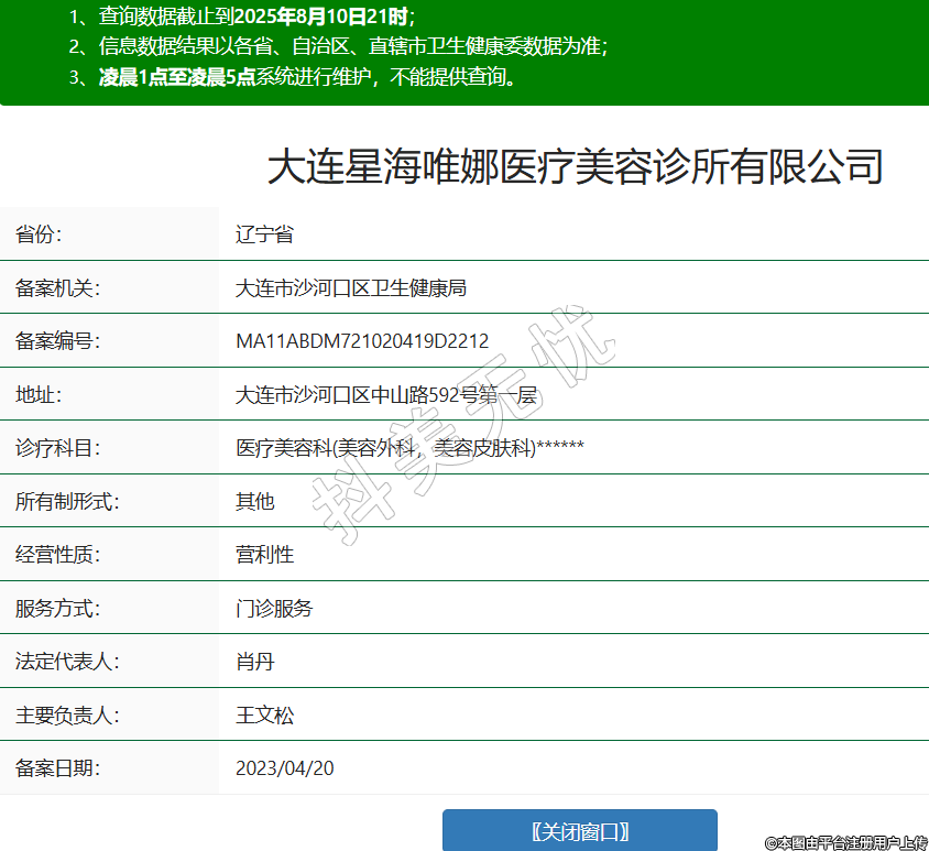 大連星海唯娜醫(yī)療美容診所有限公司,診療科目:醫(yī)療美容科(美容外科,美容皮膚科)******