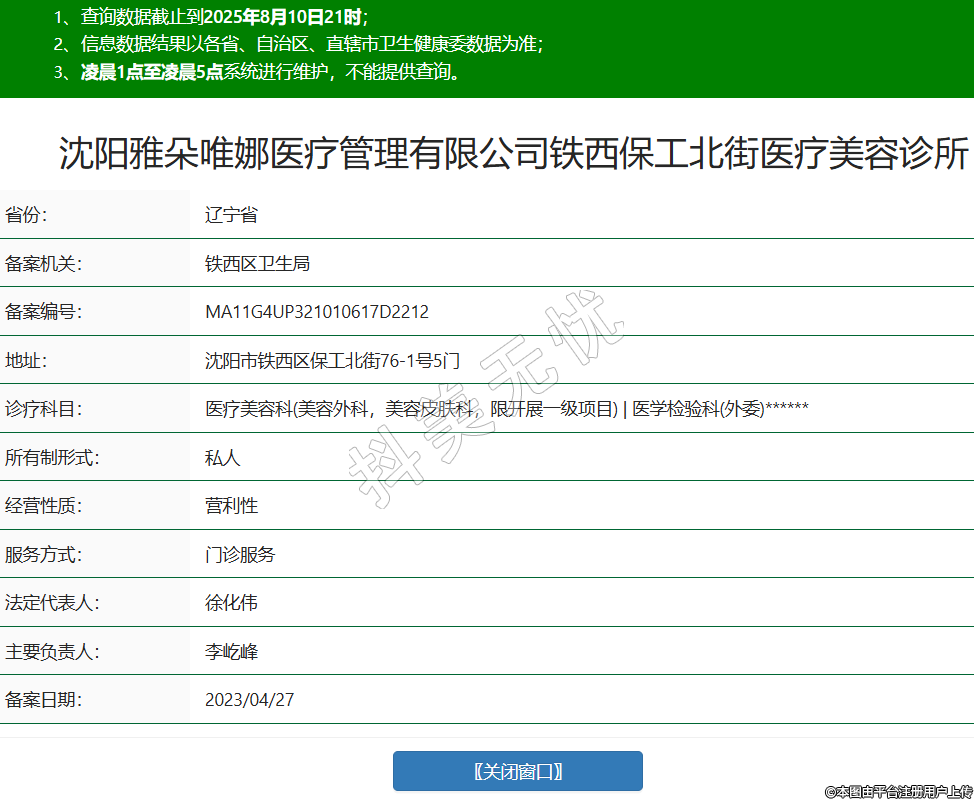 沈陽雅朵唯娜醫(yī)療管理有限公司鐵西保工北街醫(yī)療美容診所,診療科目:醫(yī)療美容科(美容外科,美容皮膚科,限開展一級項目) | 醫(yī)學(xué)檢驗科(外委)******