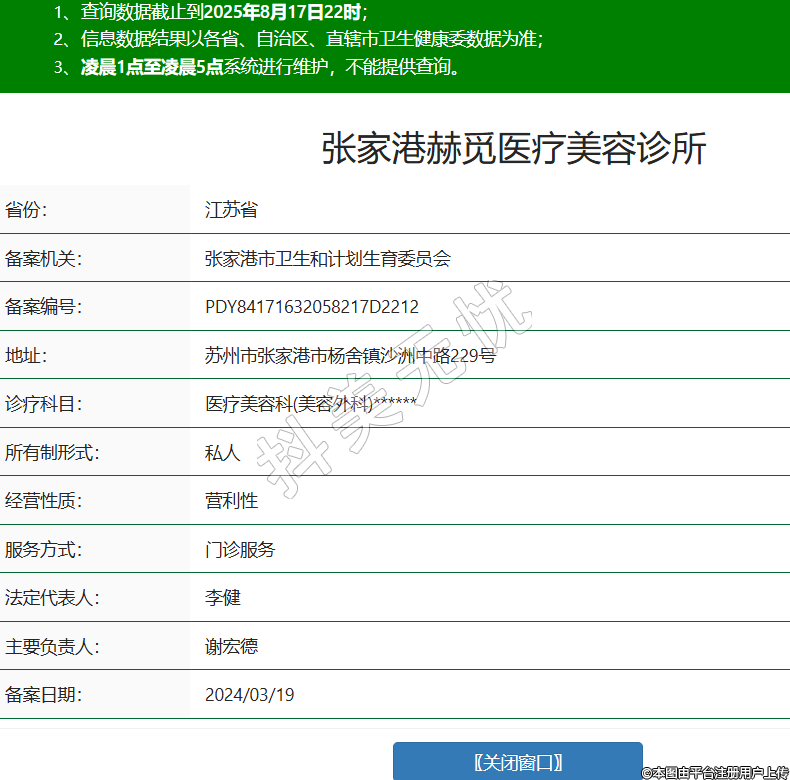省份:江蘇省備案機關:張家港市衛(wèi)生和計劃生育委員會備案編號:PDY84171632058217D2212地址:蘇州市張家港市楊舍鎮(zhèn)沙洲中路229號診療科目:醫(yī)療美容科(美容外科)******所有制形式:私人經營性質:營利性服務方式:門診服務法定代表人:李健主要負責人:謝宏德備案日期:2024/03/19 -