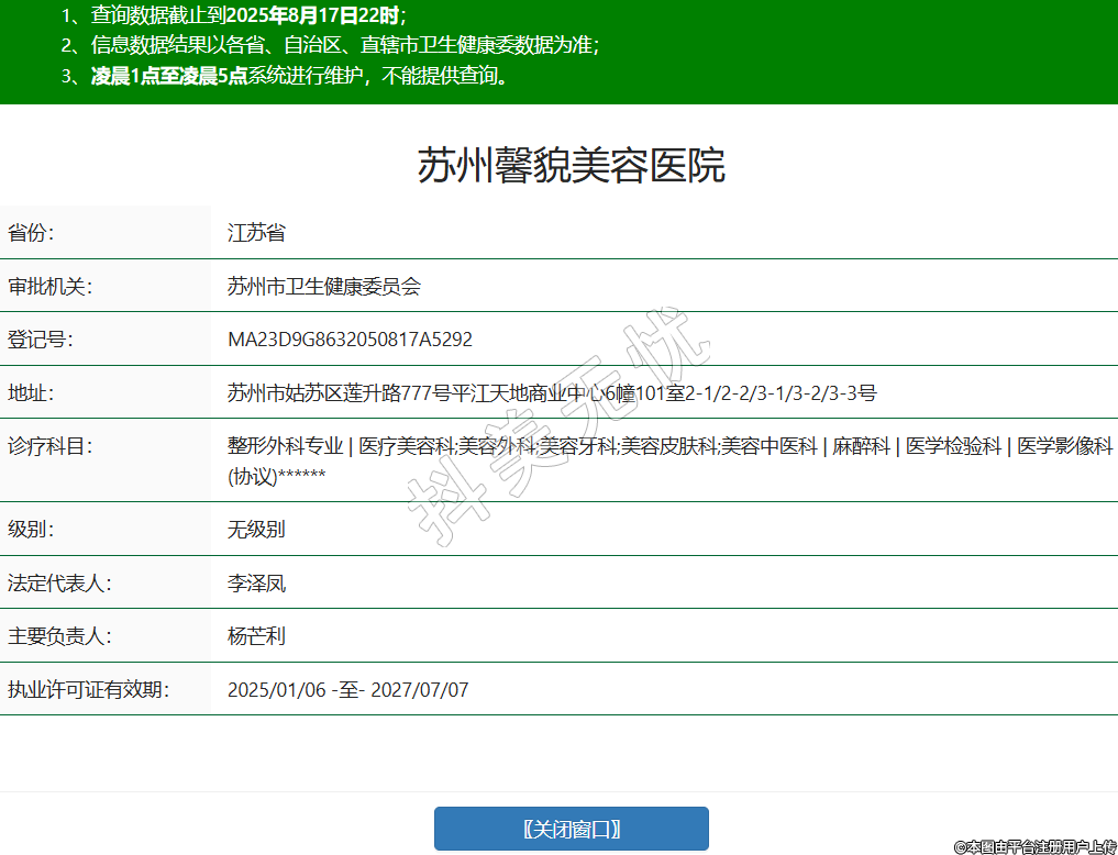 省份:江蘇省審批機(jī)關(guān):蘇州市衛(wèi)生健康委員會(huì)登記號(hào):MA23D9G8632050817A5292地址:蘇州市姑蘇區(qū)蓮升路777號(hào)平江天地商業(yè)中心6幢101室2-1/2-2/3-1/3-2/3-3號(hào)診療科目:整形外科專業(yè) | 醫(yī)療美容科;美容外科;美容牙科;美容皮膚科;美容中醫(yī)科 | 麻醉科 | 醫(yī)學(xué)檢驗(yàn)科 | 醫(yī)學(xué)影像科(協(xié)議)******級(jí)別:無級(jí)別法定代表人:李澤鳳主要負(fù)責(zé)人:楊芒利執(zhí)業(yè)許可證有效期:2025/01/06 -至- 2027/07/07 -