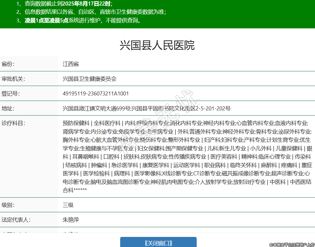 省份:江西省審批機(jī)關(guān):興國(guó)縣衛(wèi)生健康委員會(huì)登記號(hào):49195119-236073211A1001地址:興國(guó)縣瀲江鎮(zhèn)文明大道699號(hào);興國(guó)縣平固街書(shū)院文化街區(qū)2-5-201-202號(hào)診療科目:預(yù)防保健科 | 全科醫(yī)療科 | 內(nèi)科;呼吸內(nèi)科專業(yè);消化內(nèi)科專業(yè);神經(jīng)內(nèi)科專業(yè);心血管內(nèi)科專業(yè);血液內(nèi)科專業(yè);腎病學(xué)專業(yè);內(nèi)分泌專業(yè);免疫學(xué)專業(yè);老年病專業(yè) | 外科;普通外科專業(yè);神經(jīng)外科專業(yè);骨科專業(yè);泌尿外科專業(yè);胸外科專業(yè);心臟大血管外科專業(yè);燒傷科專業(yè);整形外科專業(yè) | 婦產(chǎn)科;婦科專業(yè);產(chǎn)科專業(yè);計(jì)劃生育專業(yè);優(yōu)生學(xué)專業(yè);生殖健康與不孕癥專業(yè) | 婦女保健科;圍產(chǎn)期保健專業(yè) | 兒科;新生兒專業(yè) | 小兒外科 | 兒童保健科 | 眼科 | 耳鼻咽喉科 | 口腔科 | 皮膚科;皮膚病專業(yè);性傳播疾病專業(yè) | 醫(yī)療美容科 | 精神科;臨床心理專業(yè) | 傳染科 | 結(jié)核病科 | 腫瘤科 | 急診醫(yī)學(xué)科 | 康復(fù)醫(yī)學(xué)科 | 運(yùn)動(dòng)醫(yī)學(xué)科 | 職業(yè)病科 | 臨終關(guān)懷科 | 麻醉科 | 疼痛科 | 重癥醫(yī)學(xué)科 | 醫(yī)學(xué)檢驗(yàn)科 | 病理科 | 醫(yī)學(xué)影像科;X線診斷專業(yè);CT診斷專業(yè);磁共振成像診斷專業(yè);超聲診斷專業(yè);心電診斷專業(yè);腦電及腦血流圖診斷專業(yè);神經(jīng)肌肉電圖專業(yè);介入放射學(xué)專業(yè);放射治療專業(yè) | 中醫(yī)科 | 中西醫(yī)結(jié)合科******級(jí)別:三級(jí)法定代表人:朱艷萍主要負(fù)責(zé)人:朱艷萍執(zhí)業(yè)許可證有效期:2017/12/28 -至- 2031/12/31 -