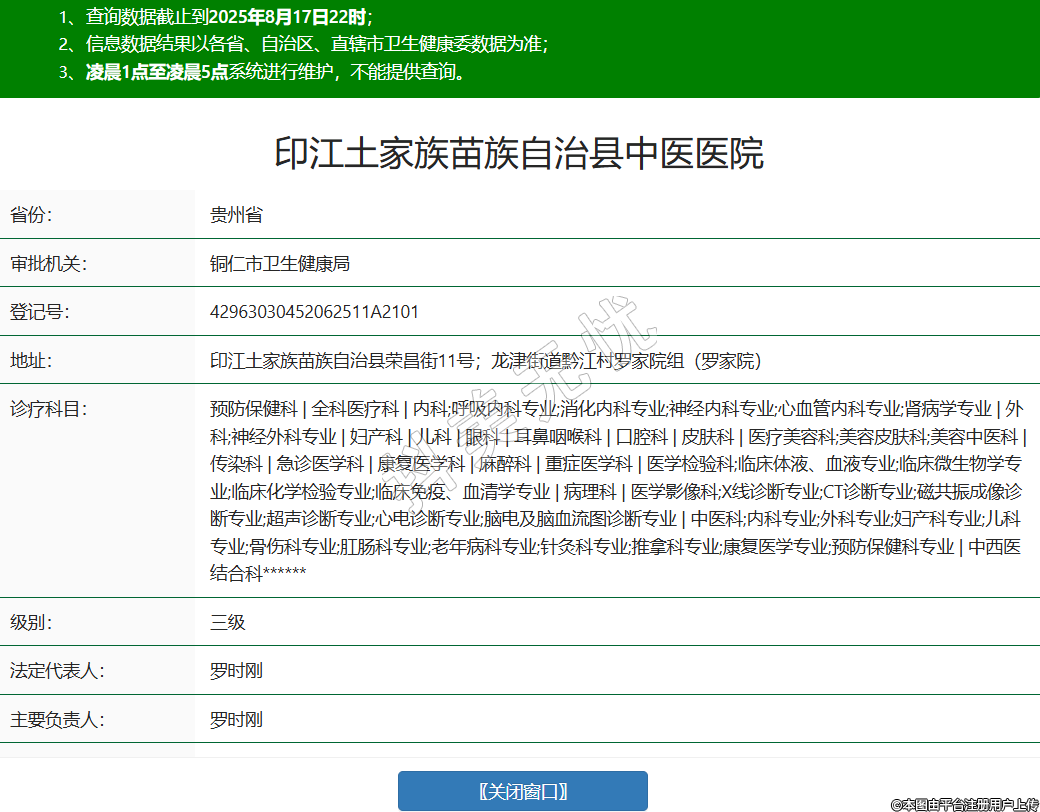 省份:貴州省審批機關:銅仁市衛(wèi)生健康局登記號:42963030452062511A2101地址:印江土家族苗族自治縣榮昌街11號;龍津街道黔江村羅家院組(羅家院)診療科目:預防保健科 | 全科醫(yī)療科 | 內科;呼吸內科專業(yè);消化內科專業(yè);神經內科專業(yè);心血管內科專業(yè);腎病學專業(yè) | 外科;神經外科專業(yè) | 婦產科 | 兒科 | 眼科 | 耳鼻咽喉科 | 口腔科 | 皮膚科 | 醫(yī)療美容科;美容皮膚科;美容中醫(yī)科 | 傳染科 | 急診醫(yī)學科 | 康復醫(yī)學科 | 麻醉科 | 重癥醫(yī)學科 | 醫(yī)學檢驗科;臨床體液、血液專業(yè);臨床微生物學專業(yè);臨床化學檢驗專業(yè);臨床免疫、血清學專業(yè) | 病理科 | 醫(yī)學影像科;X線診斷專業(yè);CT診斷專業(yè);磁共振成像診斷專業(yè);超聲診斷專業(yè);心電診斷專業(yè);腦電及腦血流圖診斷專業(yè) | 中醫(yī)科;內科專業(yè);外科專業(yè);婦產科專業(yè);兒科專業(yè);骨傷科專業(yè);肛腸科專業(yè);老年病科專業(yè);針灸科專業(yè);推拿科專業(yè);康復醫(yī)學專業(yè);預防保健科專業(yè) | 中西醫(yī)結合科******級別:三級法定代表人:羅時剛主要負責人:羅時剛執(zhí)業(yè)許可證有效期:2017/09/21 -至- 2032/09/20 -