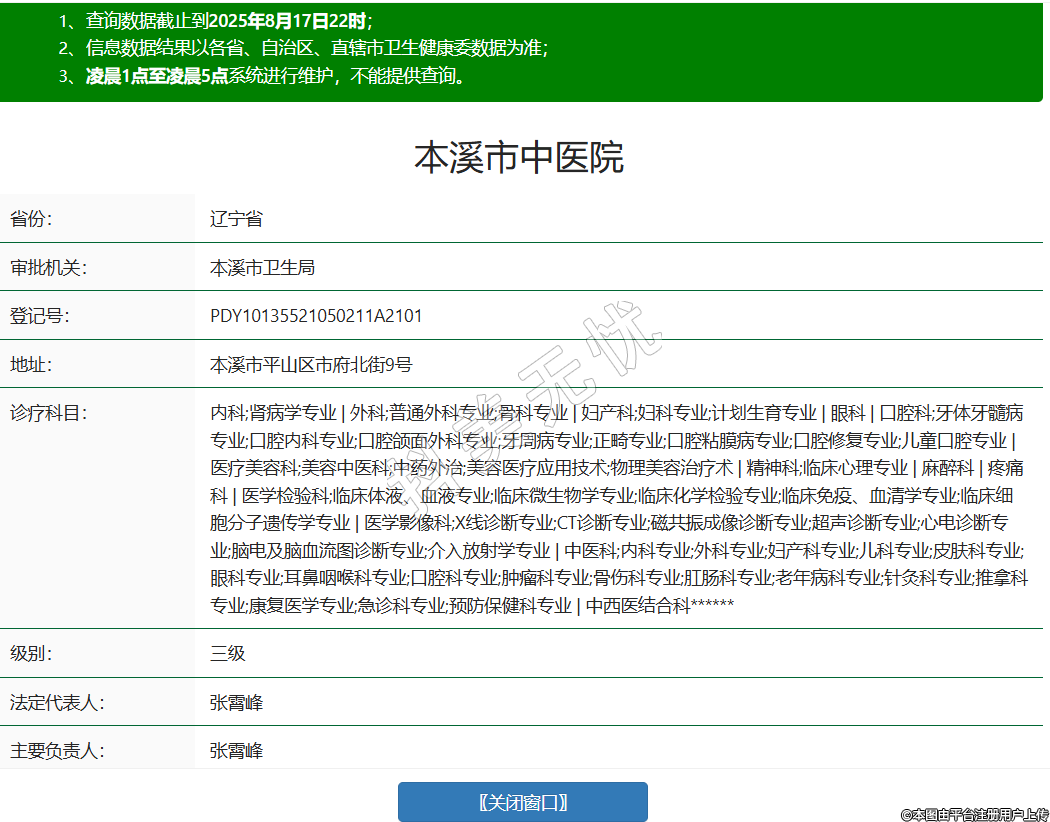 省份:遼寧省審批機(jī)關(guān):本溪市衛(wèi)生局登記號:PDY10135521050211A2101地址:本溪市平山區(qū)市府北街9號診療科目:內(nèi)科;腎病學(xué)專業(yè) | 外科;普通外科專業(yè);骨科專業(yè) | 婦產(chǎn)科;婦科專業(yè);計劃生育專業(yè) | 眼科 | 口腔科;牙體牙髓病專業(yè);口腔內(nèi)科專業(yè);口腔頜面外科專業(yè);牙周病專業(yè);正畸專業(yè);口腔粘膜病專業(yè);口腔修復(fù)專業(yè);兒童口腔專業(yè) | 醫(yī)療美容科;美容中醫(yī)科;中藥外治;美容醫(yī)療應(yīng)用技術(shù);物理美容治療術(shù) | 精神科;臨床心理專業(yè) | 麻醉科 | 疼痛科 | 醫(yī)學(xué)檢驗(yàn)科;臨床體液、血液專業(yè);臨床微生物學(xué)專業(yè);臨床化學(xué)檢驗(yàn)專業(yè);臨床免疫、血清學(xué)專業(yè);臨床細(xì)胞分子遺傳學(xué)專業(yè) | 醫(yī)學(xué)影像科;X線診斷專業(yè);CT診斷專業(yè);磁共振成像診斷專業(yè);超聲診斷專業(yè);心電診斷專業(yè);腦電及腦血流圖診斷專業(yè);介入放射學(xué)專業(yè) | 中醫(yī)科;內(nèi)科專業(yè);外科專業(yè);婦產(chǎn)科專業(yè);兒科專業(yè);皮膚科專業(yè);眼科專業(yè);耳鼻咽喉科專業(yè);口腔科專業(yè);腫瘤科專業(yè);骨傷科專業(yè);肛腸科專業(yè);老年病科專業(yè);針灸科專業(yè);推拿科專業(yè);康復(fù)醫(yī)學(xué)專業(yè);急診科專業(yè);預(yù)防保健科專業(yè) | 中西醫(yī)結(jié)合科******級別:三級法定代表人:張霄峰主要負(fù)責(zé)人:張霄峰執(zhí)業(yè)許可證有效期:2012/03/30 -至- 2027/03/30 -