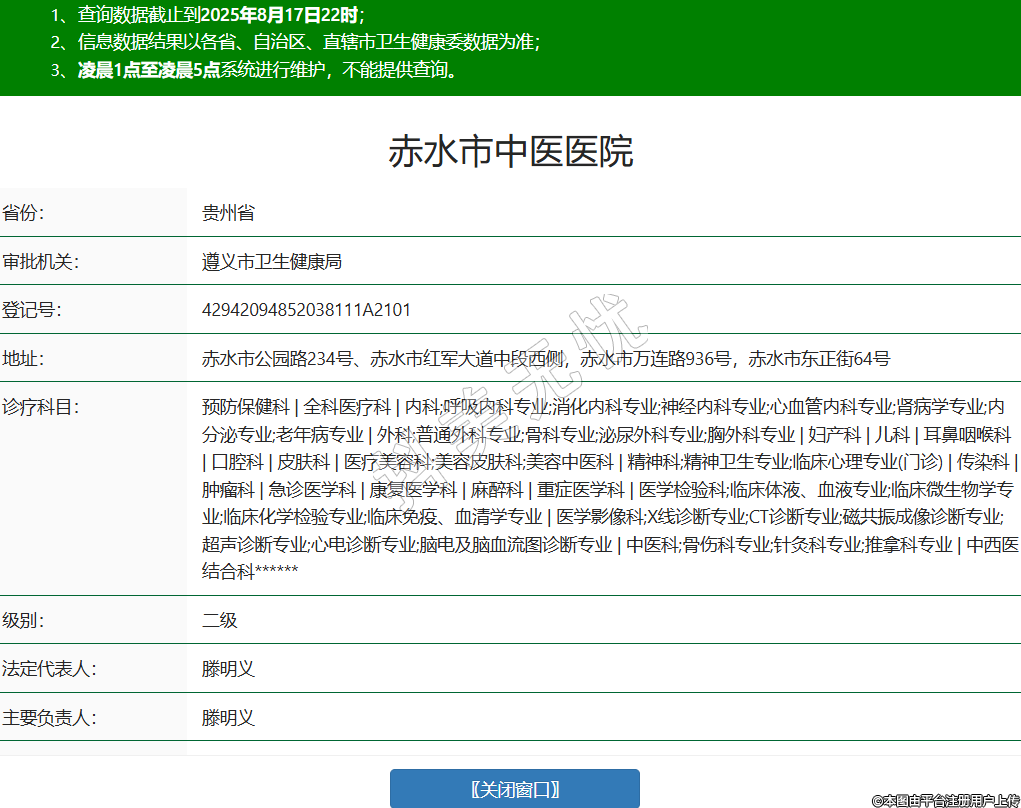 省份:貴州省審批機關:遵義市衛(wèi)生健康局登記號:42942094852038111A2101地址:赤水市公園路234號、赤水市紅軍大道中段西側,赤水市萬連路936號,赤水市東正街64號診療科目:預防保健科 | 全科醫(yī)療科 | 內(nèi)科;呼吸內(nèi)科專業(yè);消化內(nèi)科專業(yè);神經(jīng)內(nèi)科專業(yè);心血管內(nèi)科專業(yè);腎病學專業(yè);內(nèi)分泌專業(yè);老年病專業(yè) | 外科;普通外科專業(yè);骨科專業(yè);泌尿外科專業(yè);胸外科專業(yè) | 婦產(chǎn)科 | 兒科 | 耳鼻咽喉科 | 口腔科 | 皮膚科 | 醫(yī)療美容科;美容皮膚科;美容中醫(yī)科 | 精神科;精神衛(wèi)生專業(yè);臨床心理專業(yè)(門診) | 傳染科 | 腫瘤科 | 急診醫(yī)學科 | 康復醫(yī)學科 | 麻醉科 | 重癥醫(yī)學科 | 醫(yī)學檢驗科;臨床體液、血液專業(yè);臨床微生物學專業(yè);臨床化學檢驗專業(yè);臨床免疫、血清學專業(yè) | 醫(yī)學影像科;X線診斷專業(yè);CT診斷專業(yè);磁共振成像診斷專業(yè);超聲診斷專業(yè);心電診斷專業(yè);腦電及腦血流圖診斷專業(yè) | 中醫(yī)科;骨傷科專業(yè);針灸科專業(yè);推拿科專業(yè) | 中西醫(yī)結合科******級別:二級法定代表人:滕明義主要負責人:滕明義執(zhí)業(yè)許可證有效期:2014/05/01 -至- 2029/04/30 -