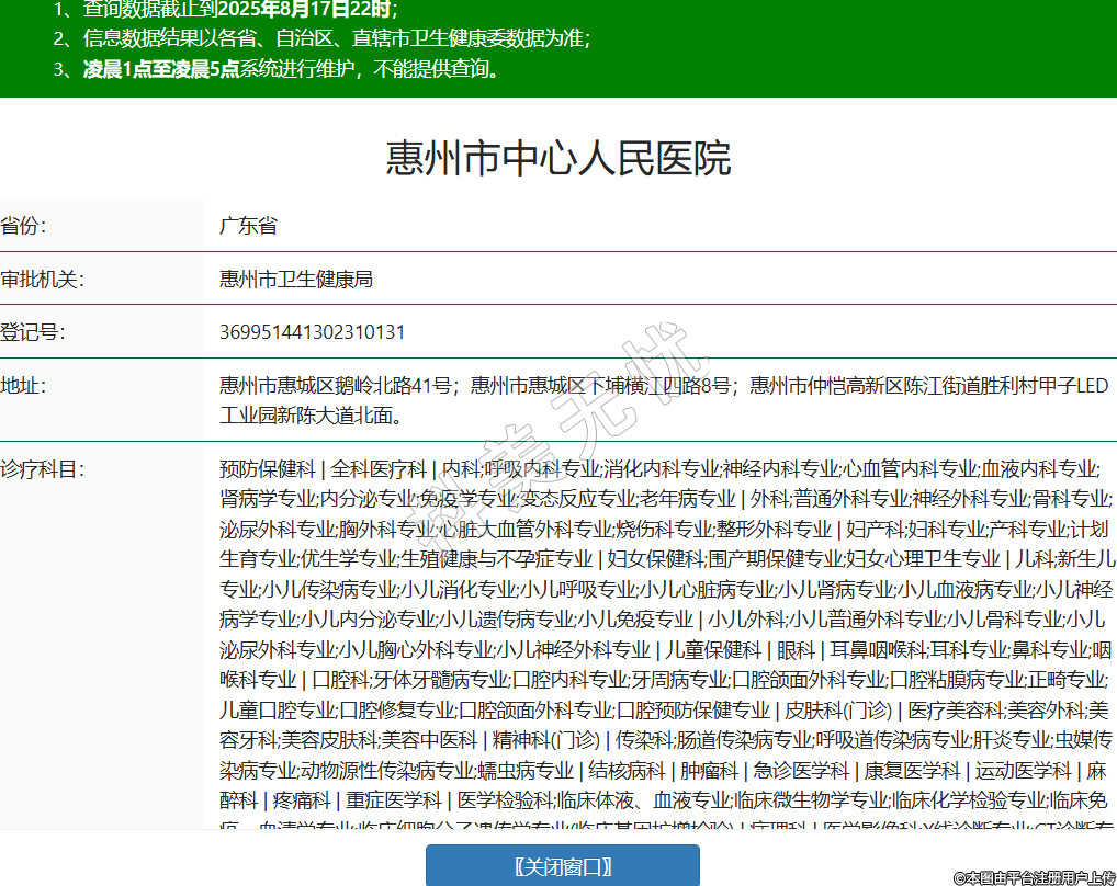 省份:廣東省審批機(jī)關(guān):惠州市衛(wèi)生健康局登記號:369951441302310131地址:惠州市惠城區(qū)鵝嶺北路41號;惠州市惠城區(qū)下埔橫江四路8號;惠州市仲愷高新區(qū)陳江街道勝利村甲子LED工業(yè)園新陳大道北面。診療科目:預(yù)防保健科 | 全科醫(yī)療科 | 內(nèi)科;呼吸內(nèi)科專業(yè);消化內(nèi)科專業(yè);神經(jīng)內(nèi)科專業(yè);心血管內(nèi)科專業(yè);血液內(nèi)科專業(yè);腎病學(xué)專業(yè);內(nèi)分泌專業(yè);免疫學(xué)專業(yè);變態(tài)反應(yīng)專業(yè);老年病專業(yè) | 外科;普通外科專業(yè);神經(jīng)外科專業(yè);骨科專業(yè);泌尿外科專業(yè);胸外科專業(yè);心臟大血管外科專業(yè);燒傷科專業(yè);整形外科專業(yè) | 婦產(chǎn)科;婦科專業(yè);產(chǎn)科專業(yè);計劃生育專業(yè);優(yōu)生學(xué)專業(yè);生殖健康與不孕癥專業(yè) | 婦女保健科;圍產(chǎn)期保健專業(yè);婦女心理衛(wèi)生專業(yè) | 兒科;新生兒專業(yè);小兒傳染病專業(yè);小兒消化專業(yè);小兒呼吸專業(yè);小兒心臟病專業(yè);小兒腎病專業(yè);小兒血液病專業(yè);小兒神經(jīng)病學(xué)專業(yè);小兒內(nèi)分泌專業(yè);小兒遺傳病專業(yè);小兒免疫專業(yè) | 小兒外科;小兒普通外科專業(yè);小兒骨科專業(yè);小兒泌尿外科專業(yè);小兒胸心外科專業(yè);小兒神經(jīng)外科專業(yè) | 兒童保健科 | 眼科 | 耳鼻咽喉科;耳科專業(yè);鼻科專業(yè);咽喉科專業(yè) | 口腔科;牙體牙髓病專業(yè);口腔內(nèi)科專業(yè);牙周病專業(yè);口腔頜面外科專業(yè);口腔粘膜病專業(yè);正畸專業(yè);兒童口腔專業(yè);口腔修復(fù)專業(yè);口腔頜面外科專業(yè);口腔預(yù)防保健專業(yè) | 皮膚科(門診) | 醫(yī)療美容科;美容外科;美容牙科;美容皮膚科;美容中醫(yī)科 | 精神科(門診) | 傳染科;腸道傳染病專業(yè);呼吸道傳染病專業(yè);肝炎專業(yè);蟲媒傳染病專業(yè);動物源性傳染病專業(yè);蠕蟲病專業(yè) | 結(jié)核病科 | 腫瘤科 | 急診醫(yī)學(xué)科 | 康復(fù)醫(yī)學(xué)科 | 運(yùn)動醫(yī)學(xué)科 | 麻醉科 | 疼痛科 | 重癥醫(yī)學(xué)科 | 醫(yī)學(xué)檢驗(yàn)科;臨床體液、血液專業(yè);臨床微生物學(xué)專業(yè);臨床化學(xué)檢驗(yàn)專業(yè);臨床免疫、血清學(xué)專業(yè);臨床細(xì)胞分子遺傳學(xué)專業(yè)(臨床基因擴(kuò)增檢驗(yàn)) | 病理科 | 醫(yī)學(xué)影像科;X線診斷專業(yè);CT診斷專業(yè);磁共振成像診斷專業(yè);核醫(yī)學(xué)專業(yè);超聲診斷專業(yè);心電診斷專業(yè);腦電及腦血流圖診斷專業(yè);神經(jīng)肌肉電圖專業(yè);介入放射學(xué)專業(yè);放射治療專業(yè) | 中醫(yī)科 | 中西醫(yī)結(jié)合科******級別:三級法定代表人:紀(jì)燕琴主要負(fù)責(zé)人:紀(jì)燕琴執(zhí)業(yè)許可證有效期:2024/03/20 -至- 2029/12/04 -