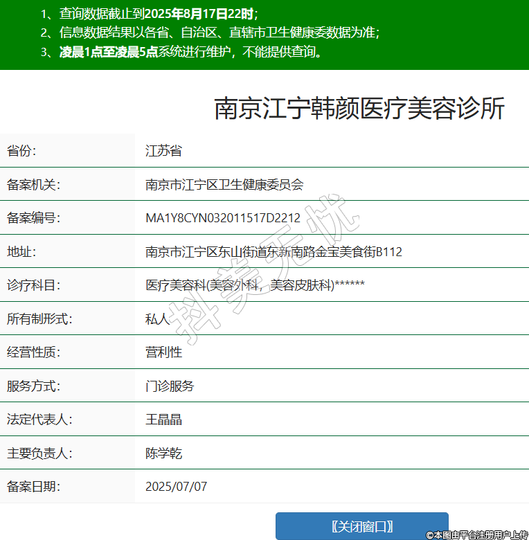 省份:江蘇省備案機(jī)關(guān):南京市江寧區(qū)衛(wèi)生健康委員會(huì)備案編號(hào):MA1Y8CYN032011517D2212地址:南京市江寧區(qū)東山街道東新南路金寶美食街B112診療科目:醫(yī)療美容科(美容外科,美容皮膚科)******所有制形式:私人經(jīng)營(yíng)性質(zhì):營(yíng)利性服務(wù)方式:門診服務(wù)法定代表人:王晶晶主要負(fù)責(zé)人:陳學(xué)乾備案日期:2025/07/07 -