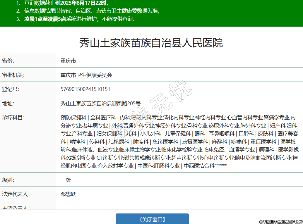 省份:重慶市審批機關(guān):重慶市衛(wèi)生健康委員會登記號:576901500241510151地址:秀山土家族苗族自治縣迎鳳路205號診療科目:預(yù)防保健科 | 全科醫(yī)療科 | 內(nèi)科;呼吸內(nèi)科專業(yè);消化內(nèi)科專業(yè);神經(jīng)內(nèi)科專業(yè);心血管內(nèi)科專業(yè);腎病學(xué)專業(yè);內(nèi)分泌專業(yè);老年病專業(yè) | 外科;普通外科專業(yè);神經(jīng)外科專業(yè);骨科專業(yè);泌尿外科專業(yè);胸外科專業(yè) | 婦產(chǎn)科;婦科專業(yè);產(chǎn)科專業(yè) | 婦女保健科 | 兒科 | 小兒外科 | 兒童保健科 | 眼科 | 耳鼻咽喉科 | 口腔科 | 皮膚科 | 醫(yī)療美容科 | 精神科 | 傳染科 | 結(jié)核病科 | 腫瘤科 | 急診醫(yī)學(xué)科 | 康復(fù)醫(yī)學(xué)科 | 麻醉科 | 疼痛科 | 重癥醫(yī)學(xué)科 | 醫(yī)學(xué)檢驗科;臨床體液、血液專業(yè);臨床微生物學(xué)專業(yè);臨床化學(xué)檢驗專業(yè);臨床免疫、血清學(xué)專業(yè) | 病理科 | 醫(yī)學(xué)影像科;X線診斷專業(yè);CT診斷專業(yè);磁共振成像診斷專業(yè);超聲診斷專業(yè);心電診斷專業(yè);腦電及腦血流圖診斷專業(yè);神經(jīng)肌肉電圖專業(yè);介入放射學(xué)專業(yè) | 中醫(yī)科;肛腸科專業(yè) | 中西醫(yī)結(jié)合科******級別:三級法定代表人:鄧忠躍主要負責人:執(zhí)業(yè)許可證有效期:2016/08/30 -至- 2031/08/29 -