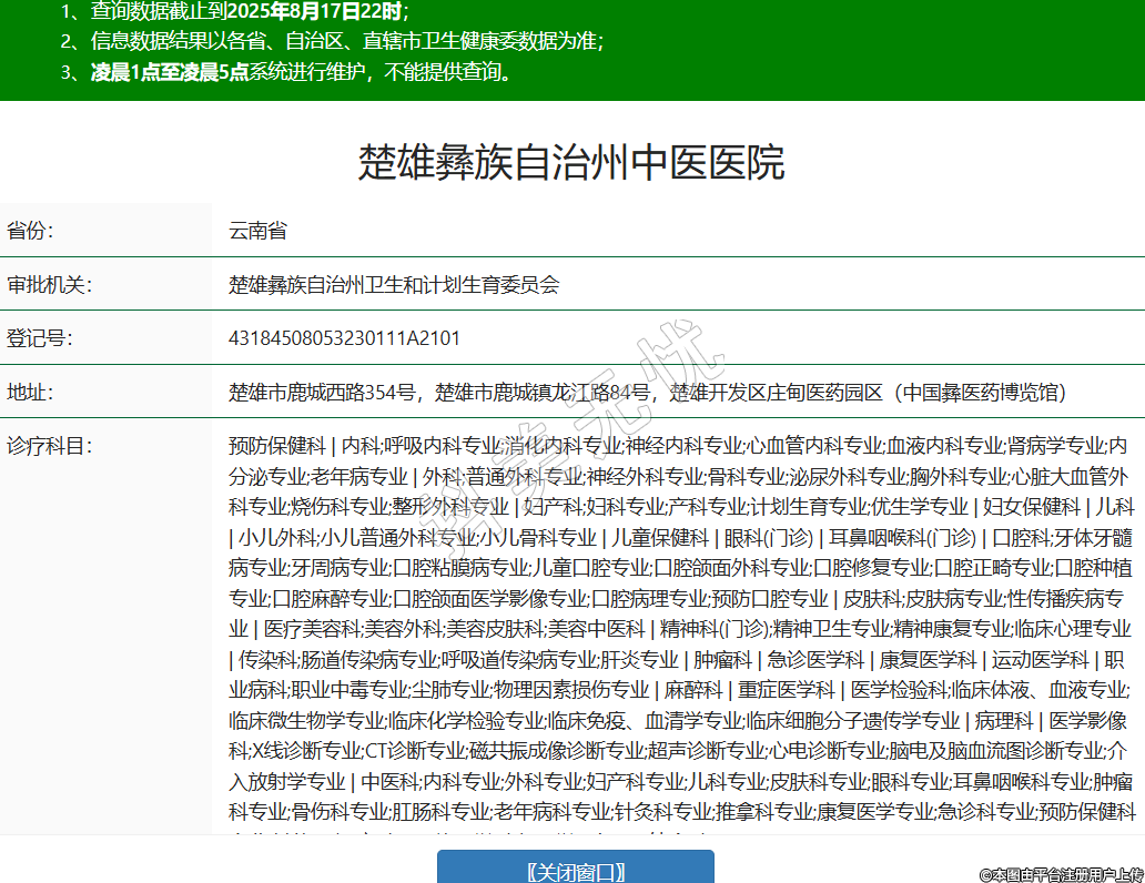 省份:云南省審批機(jī)關(guān):楚雄彝族自治州衛(wèi)生和計(jì)劃生育委員會(huì)登記號(hào):43184508053230111A2101地址:楚雄市鹿城西路354號(hào),楚雄市鹿城鎮(zhèn)龍江路84號(hào),楚雄開(kāi)發(fā)區(qū)莊甸醫(yī)藥園區(qū)(中國(guó)彝醫(yī)藥博覽館)診療科目:預(yù)防保健科 | 內(nèi)科;呼吸內(nèi)科專業(yè);消化內(nèi)科專業(yè);神經(jīng)內(nèi)科專業(yè);心血管內(nèi)科專業(yè);血液內(nèi)科專業(yè);腎病學(xué)專業(yè);內(nèi)分泌專業(yè);老年病專業(yè) | 外科;普通外科專業(yè);神經(jīng)外科專業(yè);骨科專業(yè);泌尿外科專業(yè);胸外科專業(yè);心臟大血管外科專業(yè);燒傷科專業(yè);整形外科專業(yè) | 婦產(chǎn)科;婦科專業(yè);產(chǎn)科專業(yè);計(jì)劃生育專業(yè);優(yōu)生學(xué)專業(yè) | 婦女保健科 | 兒科 | 小兒外科;小兒普通外科專業(yè);小兒骨科專業(yè) | 兒童保健科 | 眼科(門(mén)診) | 耳鼻咽喉科(門(mén)診) | 口腔科;牙體牙髓病專業(yè);牙周病專業(yè);口腔粘膜病專業(yè);兒童口腔專業(yè);口腔頜面外科專業(yè);口腔修復(fù)專業(yè);口腔正畸專業(yè);口腔種植專業(yè);口腔麻醉專業(yè);口腔頜面醫(yī)學(xué)影像專業(yè);口腔病理專業(yè);預(yù)防口腔專業(yè) | 皮膚科;皮膚病專業(yè);性傳播疾病專業(yè) | 醫(yī)療美容科;美容外科;美容皮膚科;美容中醫(yī)科 | 精神科(門(mén)診);精神衛(wèi)生專業(yè);精神康復(fù)專業(yè);臨床心理專業(yè) | 傳染科;腸道傳染病專業(yè);呼吸道傳染病專業(yè);肝炎專業(yè) | 腫瘤科 | 急診醫(yī)學(xué)科 | 康復(fù)醫(yī)學(xué)科 | 運(yùn)動(dòng)醫(yī)學(xué)科 | 職業(yè)病科;職業(yè)中毒專業(yè);塵肺專業(yè);物理因素?fù)p傷專業(yè) | 麻醉科 | 重癥醫(yī)學(xué)科 | 醫(yī)學(xué)檢驗(yàn)科;臨床體液、血液專業(yè);臨床微生物學(xué)專業(yè);臨床化學(xué)檢驗(yàn)專業(yè);臨床免疫、血清學(xué)專業(yè);臨床細(xì)胞分子遺傳學(xué)專業(yè) | 病理科 | 醫(yī)學(xué)影像科;X線診斷專業(yè);CT診斷專業(yè);磁共振成像診斷專業(yè);超聲診斷專業(yè);心電診斷專業(yè);腦電及腦血流圖診斷專業(yè);介入放射學(xué)專業(yè) | 中醫(yī)科;內(nèi)科專業(yè);外科專業(yè);婦產(chǎn)科專業(yè);兒科專業(yè);皮膚科專業(yè);眼科專業(yè);耳鼻咽喉科專業(yè);腫瘤科專業(yè);骨傷科專業(yè);肛腸科專業(yè);老年病科專業(yè);針灸科專業(yè);推拿科專業(yè);康復(fù)醫(yī)學(xué)專業(yè);急診科專業(yè);預(yù)防保健科專業(yè);其他(風(fēng)濕病科) | 民族醫(yī)學(xué)科;彝醫(yī)學(xué) | 中西醫(yī)結(jié)合科******級(jí)別:三級(jí)法定代表人:代必洪主要負(fù)責(zé)人:代必洪執(zhí)業(yè)許可證有效期:2025/08/05 -至- 2040/08/04 -