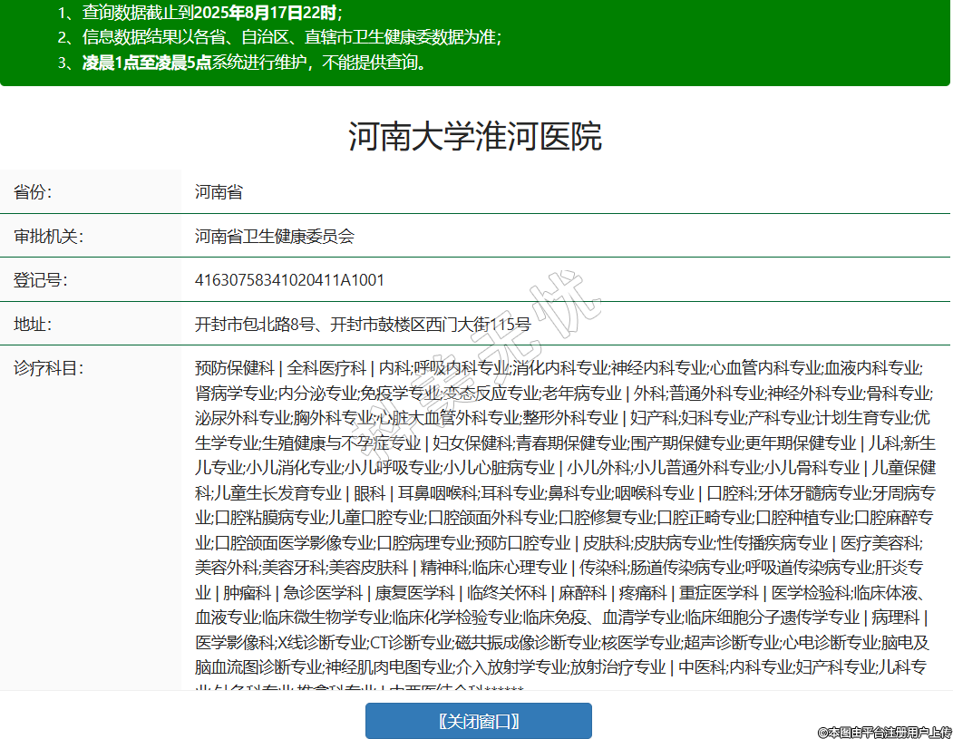 省份:河南省審批機(jī)關(guān):河南省衛(wèi)生健康委員會登記號:41630758341020411A1001地址:開封市包北路8號、開封市鼓樓區(qū)西門大街115號診療科目:預(yù)防保健科 | 全科醫(yī)療科 | 內(nèi)科;呼吸內(nèi)科專業(yè);消化內(nèi)科專業(yè);神經(jīng)內(nèi)科專業(yè);心血管內(nèi)科專業(yè);血液內(nèi)科專業(yè);腎病學(xué)專業(yè);內(nèi)分泌專業(yè);免疫學(xué)專業(yè);變態(tài)反應(yīng)專業(yè);老年病專業(yè) | 外科;普通外科專業(yè);神經(jīng)外科專業(yè);骨科專業(yè);泌尿外科專業(yè);胸外科專業(yè);心臟大血管外科專業(yè);整形外科專業(yè) | 婦產(chǎn)科;婦科專業(yè);產(chǎn)科專業(yè);計劃生育專業(yè);優(yōu)生學(xué)專業(yè);生殖健康與不孕癥專業(yè) | 婦女保健科;青春期保健專業(yè);圍產(chǎn)期保健專業(yè);更年期保健專業(yè) | 兒科;新生兒專業(yè);小兒消化專業(yè);小兒呼吸專業(yè);小兒心臟病專業(yè) | 小兒外科;小兒普通外科專業(yè);小兒骨科專業(yè) | 兒童保健科;兒童生長發(fā)育專業(yè) | 眼科 | 耳鼻咽喉科;耳科專業(yè);鼻科專業(yè);咽喉科專業(yè) | 口腔科;牙體牙髓病專業(yè);牙周病專業(yè);口腔粘膜病專業(yè);兒童口腔專業(yè);口腔頜面外科專業(yè);口腔修復(fù)專業(yè);口腔正畸專業(yè);口腔種植專業(yè);口腔麻醉專業(yè);口腔頜面醫(yī)學(xué)影像專業(yè);口腔病理專業(yè);預(yù)防口腔專業(yè) | 皮膚科;皮膚病專業(yè);性傳播疾病專業(yè) | 醫(yī)療美容科;美容外科;美容牙科;美容皮膚科 | 精神科;臨床心理專業(yè) | 傳染科;腸道傳染病專業(yè);呼吸道傳染病專業(yè);肝炎專業(yè) | 腫瘤科 | 急診醫(yī)學(xué)科 | 康復(fù)醫(yī)學(xué)科 | 臨終關(guān)懷科 | 麻醉科 | 疼痛科 | 重癥醫(yī)學(xué)科 | 醫(yī)學(xué)檢驗科;臨床體液、血液專業(yè);臨床微生物學(xué)專業(yè);臨床化學(xué)檢驗專業(yè);臨床免疫、血清學(xué)專業(yè);臨床細(xì)胞分子遺傳學(xué)專業(yè) | 病理科 | 醫(yī)學(xué)影像科;X線診斷專業(yè);CT診斷專業(yè);磁共振成像診斷專業(yè);核醫(yī)學(xué)專業(yè);超聲診斷專業(yè);心電診斷專業(yè);腦電及腦血流圖診斷專業(yè);神經(jīng)肌肉電圖專業(yè);介入放射學(xué)專業(yè);放射治療專業(yè) | 中醫(yī)科;內(nèi)科專業(yè);婦產(chǎn)科專業(yè);兒科專業(yè);針灸科專業(yè);推拿科專業(yè) | 中西醫(yī)結(jié)合科******級別:三級法定代表人:左克強(qiáng)主要負(fù)責(zé)人:***執(zhí)業(yè)許可證有效期:2024/10/30 -至- 2033/04/08 -