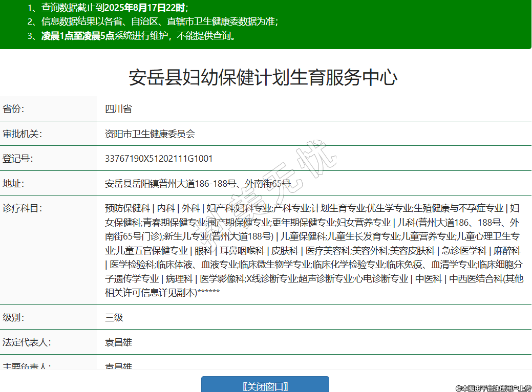 安岳縣婦幼保健計(jì)劃生育服務(wù)中心,診療科目:預(yù)防保健科 | 內(nèi)科 | 外科 | 婦產(chǎn)科 | 婦女保健科 | 兒科(普州大道186、188號、外南街65號門診);新生兒專業(yè)(普州大道188號) | 兒童保健科 | 眼科 | 耳鼻咽喉科 | 皮膚科 | 醫(yī)療美容科;美容外科;美容皮膚科 | 急診醫(yī)學(xué)科 | 麻醉科 | 醫(yī)學(xué)檢驗(yàn)科 | 病理科 | 醫(yī)學(xué)影像科;X線診斷專業(yè);超聲診斷專業(yè);心電診斷專業(yè) | 中醫(yī)科 | 中西醫(yī)結(jié)合科(其他相關(guān)許可信息詳見副本)******