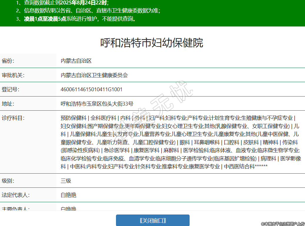 省份:內(nèi)蒙古自治區(qū)審批機(jī)關(guān):內(nèi)蒙古自治區(qū)衛(wèi)生健康委員會(huì)登記號(hào):46006114615010411G1001地址:呼和浩特市玉泉區(qū)包頭大街33號(hào)診療科目:預(yù)防保健科 | 全科醫(yī)療科 | 內(nèi)科 | 外科 | 婦產(chǎn)科;婦科專業(yè);產(chǎn)科專業(yè);計(jì)劃生育專業(yè);生殖健康與不孕癥專業(yè) | 婦女保健科;圍產(chǎn)期保健專業(yè);更年期保健專業(yè);婦女心理衛(wèi)生專業(yè);其他(乳腺保健專業(yè)、女職工保健專業(yè)) | 兒科 | 兒童保健科;兒童生長發(fā)育專業(yè);兒童營養(yǎng)專業(yè);兒童心理衛(wèi)生專業(yè);兒童康復(fù)專業(yè);其他(兒童中醫(yī)保健、兒童眼保健專業(yè)、兒童聽力篩查、兒童口腔保健專業(yè)) | 眼科 | 耳鼻咽喉科 | 口腔科 | 皮膚科 | 精神科 | 傳染科(即感染性疾病科) | 急診醫(yī)學(xué)科 | 康復(fù)醫(yī)學(xué)科 | 麻醉科 | 醫(yī)學(xué)檢驗(yàn)科;臨床體液、血液專業(yè);臨床微生物學(xué)專業(yè);臨床化學(xué)檢驗(yàn)專業(yè);臨床免疫、血清學(xué)專業(yè);臨床細(xì)胞分子遺傳學(xué)專業(yè)(臨床基因擴(kuò)增檢驗(yàn)) | 病理科 | 醫(yī)學(xué)影像科 | 中醫(yī)科;內(nèi)科專業(yè);婦產(chǎn)科專業(yè);針灸科專業(yè);推拿科專業(yè);康復(fù)醫(yī)學(xué)專業(yè) | 中西醫(yī)結(jié)合科******級(jí)別:三級(jí)法定代表人:白艷艷主要負(fù)責(zé)人:白艷艷執(zhí)業(yè)許可證有效期:2024/11/19 -至- 2036/10/07 -