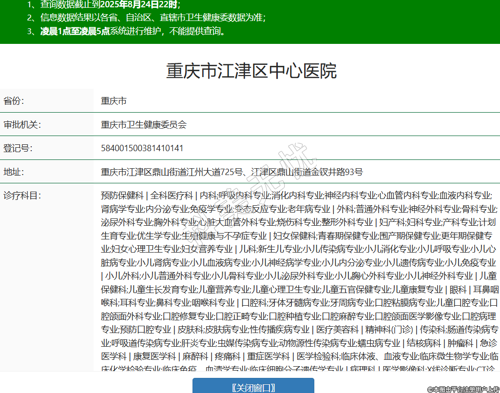省份:重慶市審批機(jī)關(guān):重慶市衛(wèi)生健康委員會(huì)登記號(hào):584001500381410141地址:重慶市江津區(qū)鼎山街道江州大道725號(hào)、江津區(qū)鼎山街道金釵井路93號(hào)診療科目:預(yù)防保健科 | 全科醫(yī)療科 | 內(nèi)科;呼吸內(nèi)科專(zhuān)業(yè);消化內(nèi)科專(zhuān)業(yè);神經(jīng)內(nèi)科專(zhuān)業(yè);心血管內(nèi)科專(zhuān)業(yè);血液內(nèi)科專(zhuān)業(yè);腎病學(xué)專(zhuān)業(yè);內(nèi)分泌專(zhuān)業(yè);免疫學(xué)專(zhuān)業(yè);變態(tài)反應(yīng)專(zhuān)業(yè);老年病專(zhuān)業(yè) | 外科;普通外科專(zhuān)業(yè);神經(jīng)外科專(zhuān)業(yè);骨科專(zhuān)業(yè);泌尿外科專(zhuān)業(yè);胸外科專(zhuān)業(yè);心臟大血管外科專(zhuān)業(yè);燒傷科專(zhuān)業(yè);整形外科專(zhuān)業(yè) | 婦產(chǎn)科;婦科專(zhuān)業(yè);產(chǎn)科專(zhuān)業(yè);計(jì)劃生育專(zhuān)業(yè);優(yōu)生學(xué)專(zhuān)業(yè);生殖健康與不孕癥專(zhuān)業(yè) | 婦女保健科;青春期保健專(zhuān)業(yè);圍產(chǎn)期保健專(zhuān)業(yè);更年期保健專(zhuān)業(yè);婦女心理衛(wèi)生專(zhuān)業(yè);婦女營(yíng)養(yǎng)專(zhuān)業(yè) | 兒科;新生兒專(zhuān)業(yè);小兒傳染病專(zhuān)業(yè);小兒消化專(zhuān)業(yè);小兒呼吸專(zhuān)業(yè);小兒心臟病專(zhuān)業(yè);小兒腎病專(zhuān)業(yè);小兒血液病專(zhuān)業(yè);小兒神經(jīng)病學(xué)專(zhuān)業(yè);小兒內(nèi)分泌專(zhuān)業(yè);小兒遺傳病專(zhuān)業(yè);小兒免疫專(zhuān)業(yè) | 小兒外科;小兒普通外科專(zhuān)業(yè);小兒骨科專(zhuān)業(yè);小兒泌尿外科專(zhuān)業(yè);小兒胸心外科專(zhuān)業(yè);小兒神經(jīng)外科專(zhuān)業(yè) | 兒童保健科;兒童生長(zhǎng)發(fā)育專(zhuān)業(yè);兒童營(yíng)養(yǎng)專(zhuān)業(yè);兒童心理衛(wèi)生專(zhuān)業(yè);兒童五官保健專(zhuān)業(yè);兒童康復(fù)專(zhuān)業(yè) | 眼科 | 耳鼻咽喉科;耳科專(zhuān)業(yè);鼻科專(zhuān)業(yè);咽喉科專(zhuān)業(yè) | 口腔科;牙體牙髓病專(zhuān)業(yè);牙周病專(zhuān)業(yè);口腔粘膜病專(zhuān)業(yè);兒童口腔專(zhuān)業(yè);口腔頜面外科專(zhuān)業(yè);口腔修復(fù)專(zhuān)業(yè);口腔正畸專(zhuān)業(yè);口腔種植專(zhuān)業(yè);口腔麻醉專(zhuān)業(yè);口腔頜面醫(yī)學(xué)影像專(zhuān)業(yè);口腔病理專(zhuān)業(yè);預(yù)防口腔專(zhuān)業(yè) | 皮膚科;皮膚病專(zhuān)業(yè);性傳播疾病專(zhuān)業(yè) | 醫(yī)療美容科 | 精神科(門(mén)診) | 傳染科;腸道傳染病專(zhuān)業(yè);呼吸道傳染病專(zhuān)業(yè);肝炎專(zhuān)業(yè);蟲(chóng)媒傳染病專(zhuān)業(yè);動(dòng)物源性傳染病專(zhuān)業(yè);蠕蟲(chóng)病專(zhuān)業(yè) | 結(jié)核病科 | 腫瘤科 | 急診醫(yī)學(xué)科 | 康復(fù)醫(yī)學(xué)科 | 麻醉科 | 疼痛科 | 重癥醫(yī)學(xué)科 | 醫(yī)學(xué)檢驗(yàn)科;臨床體液、血液專(zhuān)業(yè);臨床微生物學(xué)專(zhuān)業(yè);臨床化學(xué)檢驗(yàn)專(zhuān)業(yè);臨床免疫、血清學(xué)專(zhuān)業(yè);臨床細(xì)胞分子遺傳學(xué)專(zhuān)業(yè) | 病理科 | 醫(yī)學(xué)影像科;X線診斷專(zhuān)業(yè);CT診斷專(zhuān)業(yè);磁共振成像診斷專(zhuān)業(yè);核醫(yī)學(xué)專(zhuān)業(yè);超聲診斷專(zhuān)業(yè);心電診斷專(zhuān)業(yè);腦電及腦血流圖診斷專(zhuān)業(yè);神經(jīng)肌肉電圖專(zhuān)業(yè);介入放射學(xué)專(zhuān)業(yè);放射治療專(zhuān)業(yè) | 中醫(yī)科;內(nèi)科專(zhuān)業(yè);外科專(zhuān)業(yè);婦產(chǎn)科專(zhuān)業(yè);兒科專(zhuān)業(yè);皮膚科專(zhuān)業(yè);眼科專(zhuān)業(yè);耳鼻咽喉科專(zhuān)業(yè);口腔科專(zhuān)業(yè);腫瘤科專(zhuān)業(yè);骨傷科專(zhuān)業(yè);肛腸科專(zhuān)業(yè);老年病科專(zhuān)業(yè);針灸科專(zhuān)業(yè);推拿科專(zhuān)業(yè);康復(fù)醫(yī)學(xué)專(zhuān)業(yè);急診科專(zhuān)業(yè);預(yù)防保健科專(zhuān)業(yè) | 中西醫(yī)結(jié)合科******級(jí)別:三級(jí)法定代表人:金顯蓉主要負(fù)責(zé)人:金顯蓉執(zhí)業(yè)許可證有效期:2017/05/18 -至- 2032/05/17 -